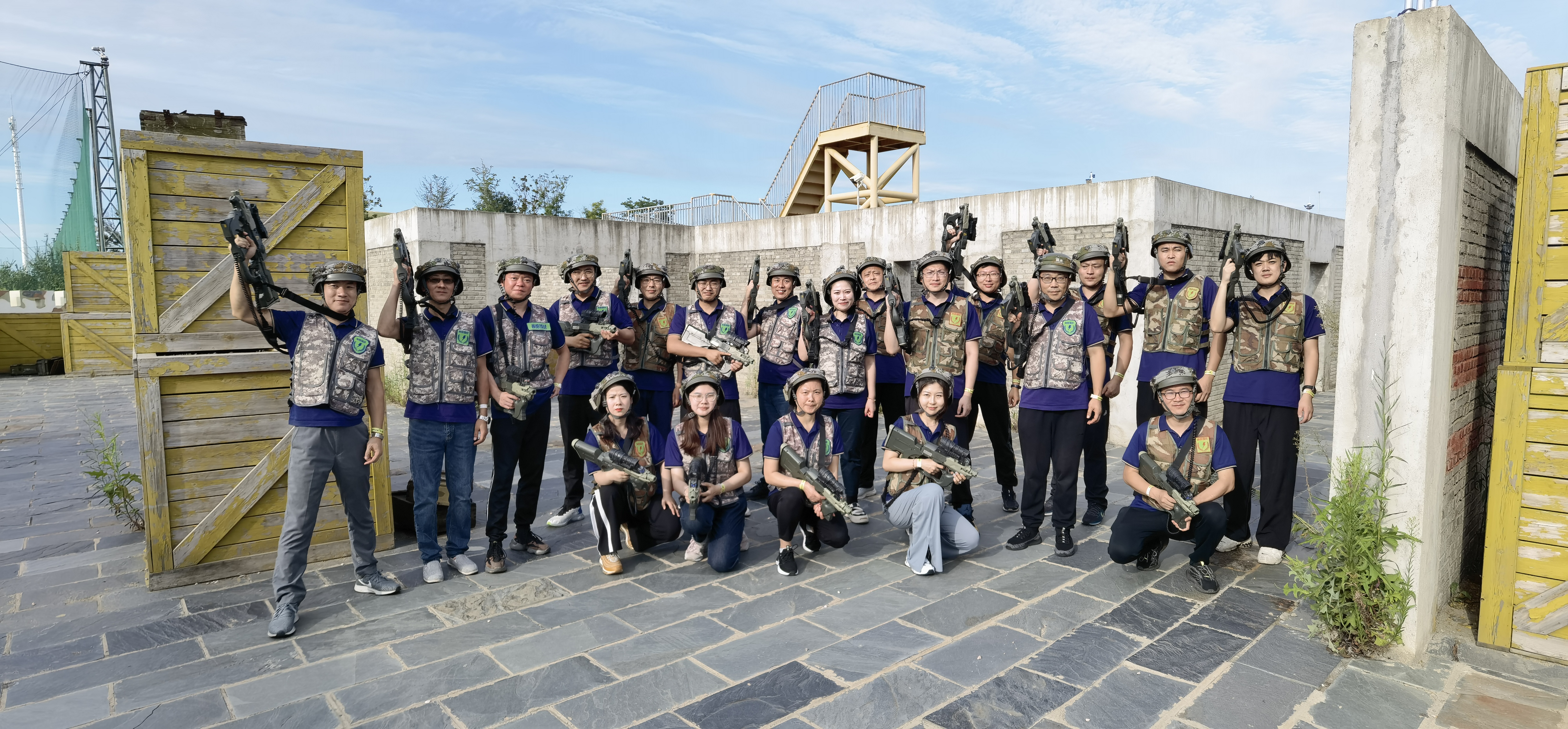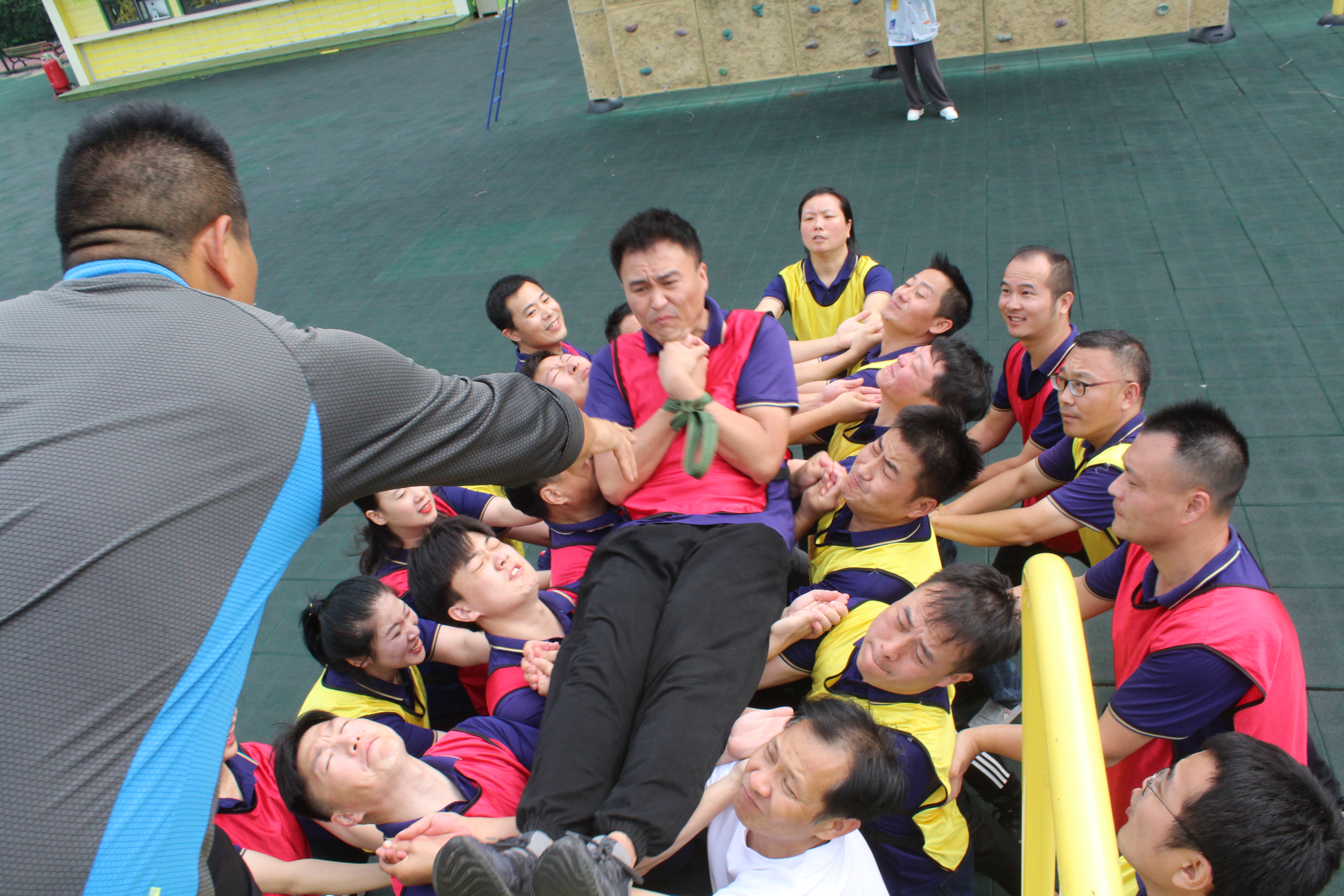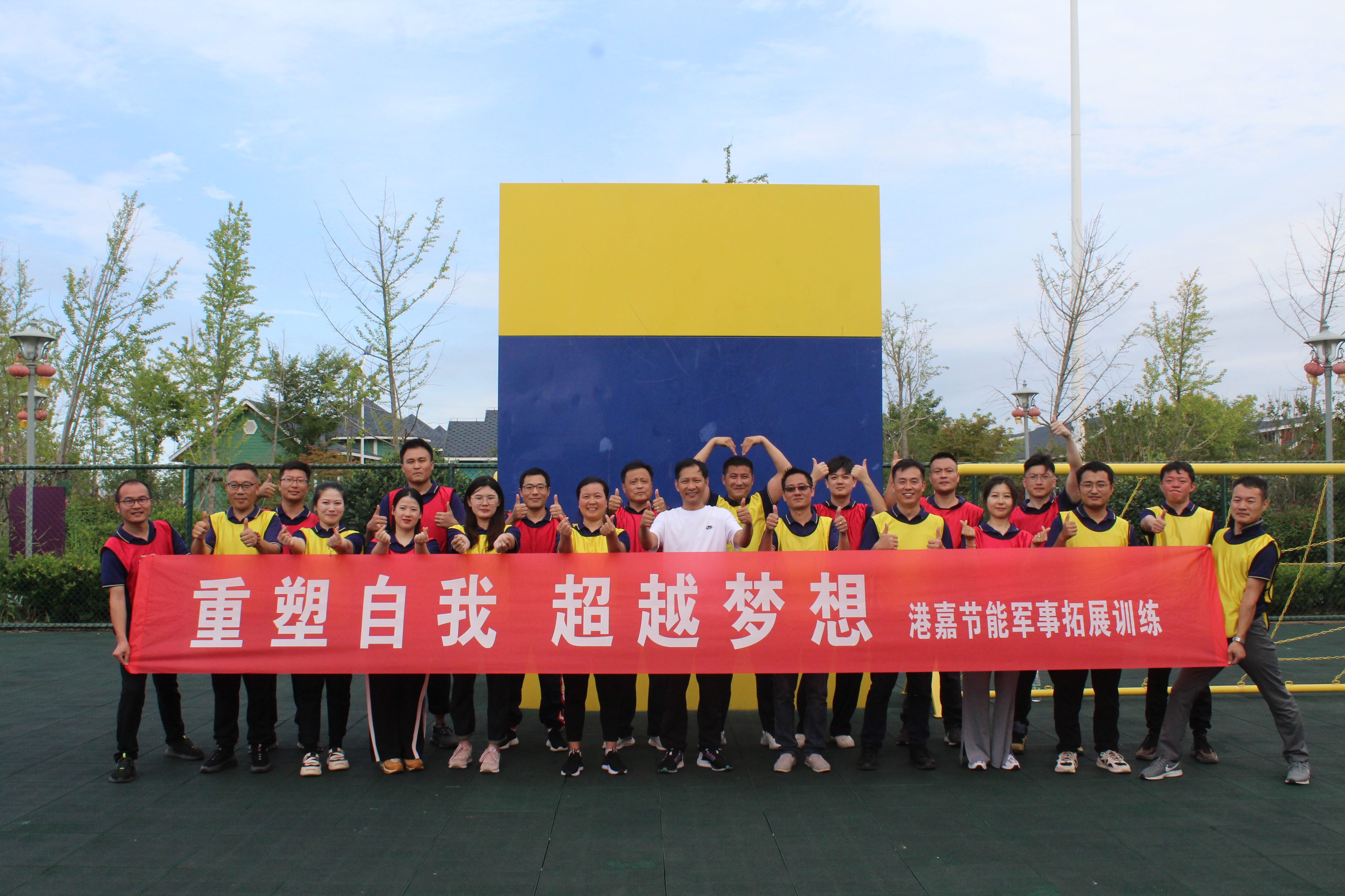 在教练员的引导下,队员们迅速进入状态,按照红、黄两种颜色组成对抗竞赛队,从一开始团队确定队长,设计团队的队名、队歌、口号和队徽就预示了此次拓展训练的整个过程都离不开集体的智慧和力量。在通过开展领袖风采、空中断桥、空中走廊、实战CS以及毕业墙等高强度的军事对抗竞赛中,队员们相互帮助,克服心理障碍和高空眩晕等困难,迎难而上,大胆挑战自我,不逃避不放弃,充分体现出了团队信任、沟通协调、团结协作的重要性,展现出港嘉公司团队上下同欲、积极向上的精神风貌。