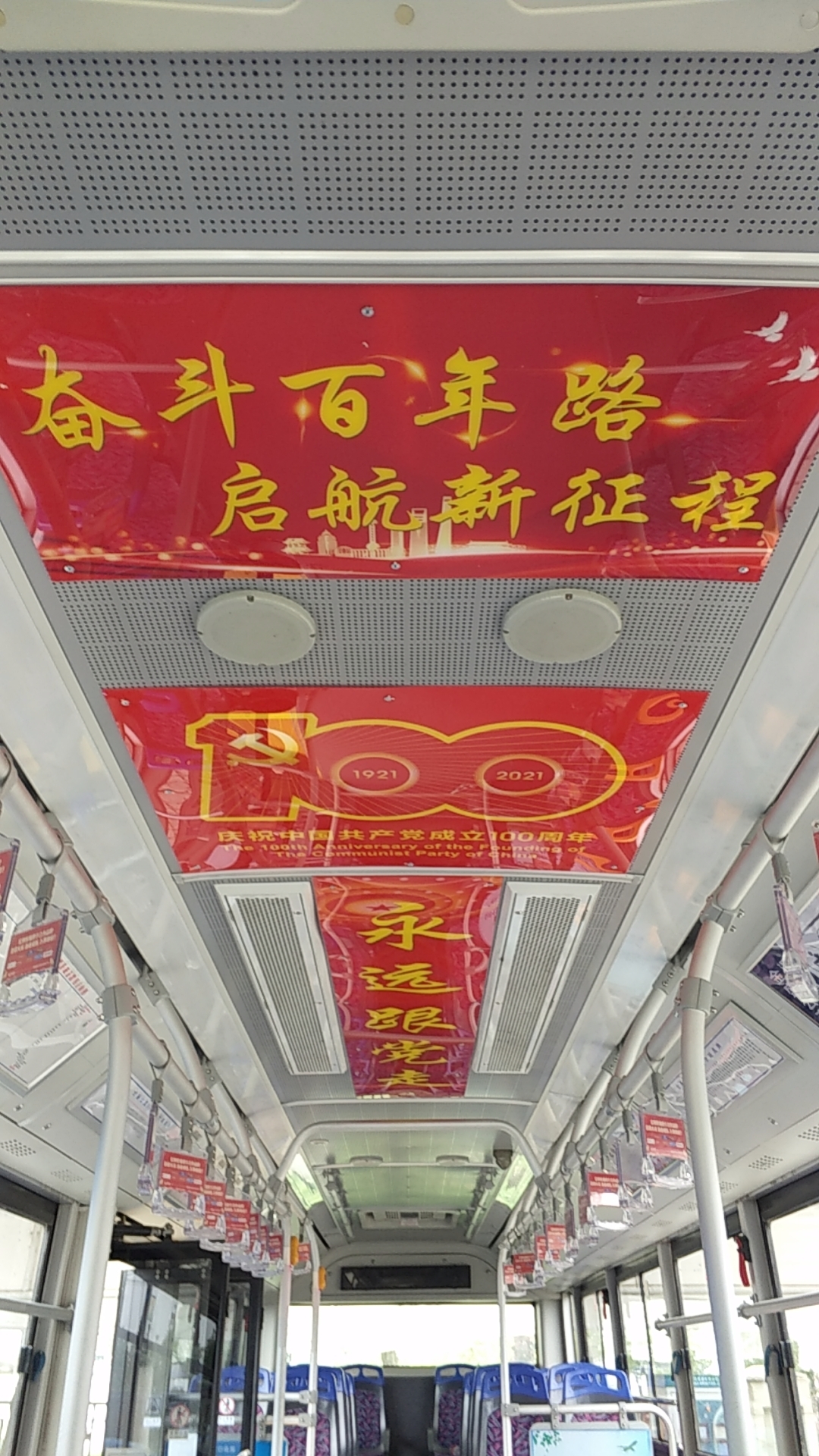 为喜迎建党百年,金盛公交公司结合行业特点,将党建宣传融入生产经营,把602路、603路公交车打造成宣传建党百年主题公交车厢,让小小车厢变身为“流动的教育课堂”。