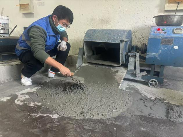 商混站在施工质量中起到源头控制的作用,在实际工作中,往往会因为供应原材料的差异导致成型的混凝土在和易性上截然不同。为优化生产服务,保证混凝土质量,通仁分公司板桥实验室特邀请外加剂供应商同新丝路检测公司的实验人员一起,全力配合商混站做好生产配合比的实时调整。