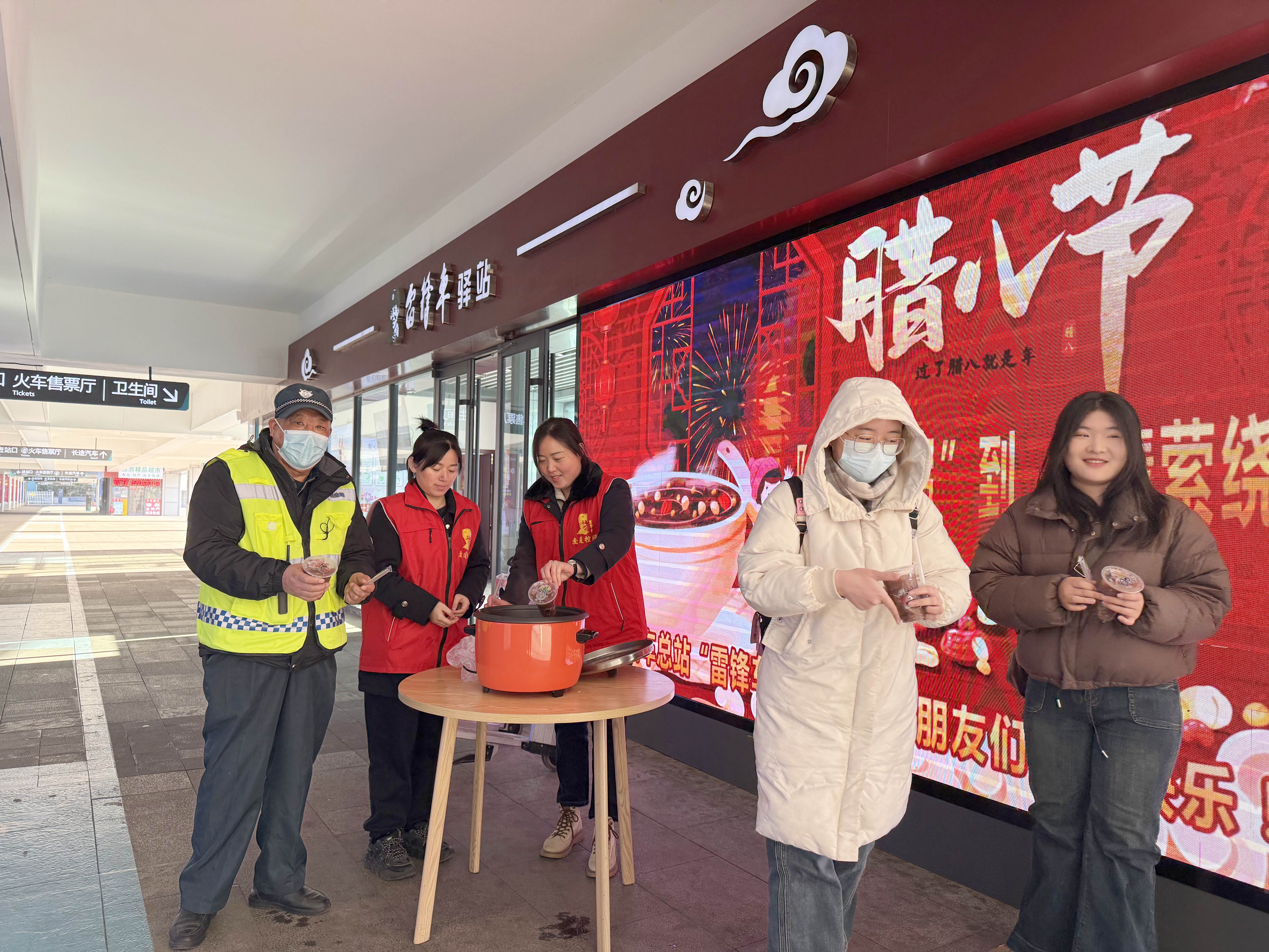 在高铁站出站口的“雷锋车”驿站前,全国人大代表、“雷锋车”手于丽婕为旅客递上腊八粥。她表示,“雷锋车”组送腊八粥活动已连续多年。“雷锋车”手们一直秉承“宁愿自己千般苦 不愿旅客一时难”的服务宗旨,让每一位途经连云港市的旅客都能带着美好的心情开启旅程,平安到家。