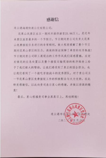 近日,花果山景区向市交通控股世界杯app最新版下载,世界杯(中国)权属公交世界杯app最新版下载,世界杯(中国)送来了一封感谢信,感谢公交世界杯app最新版下载,世界杯(中国)在五一期间高效的保障了游客的有序疏散。