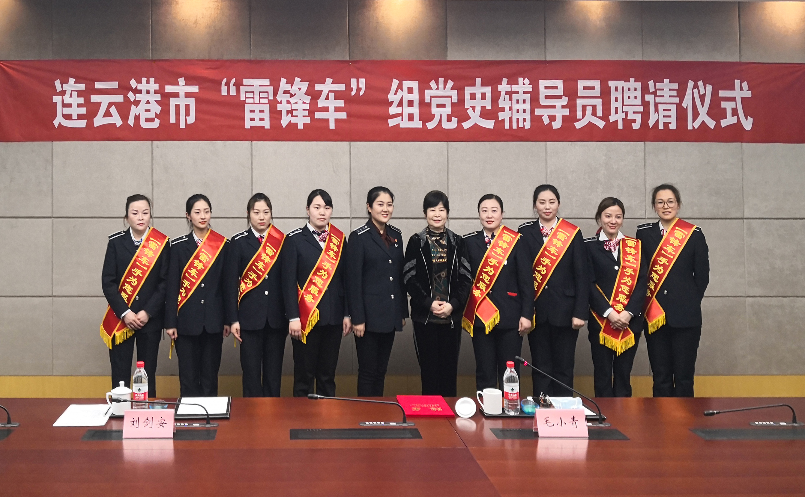 刘永能为毛小青颁发聘书,聘请其为连云港市“雷锋车”组党史辅导员。