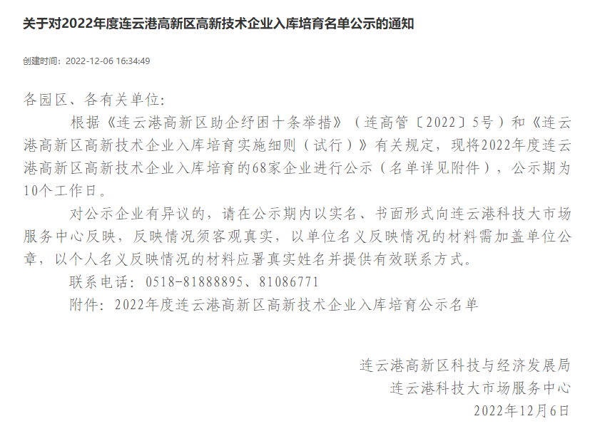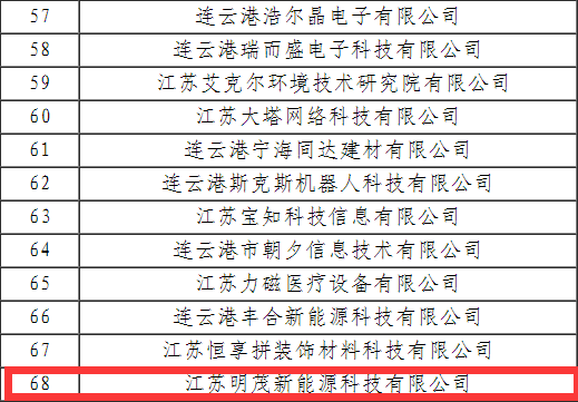 20221219日,《连云港高新区高新技术企业入库培育实施细则(试行)》公示期结束,江苏明茂新能源科技有限公司(以下简称“明茂公司”)成功加入连云港高新区高新技术企业培育库。