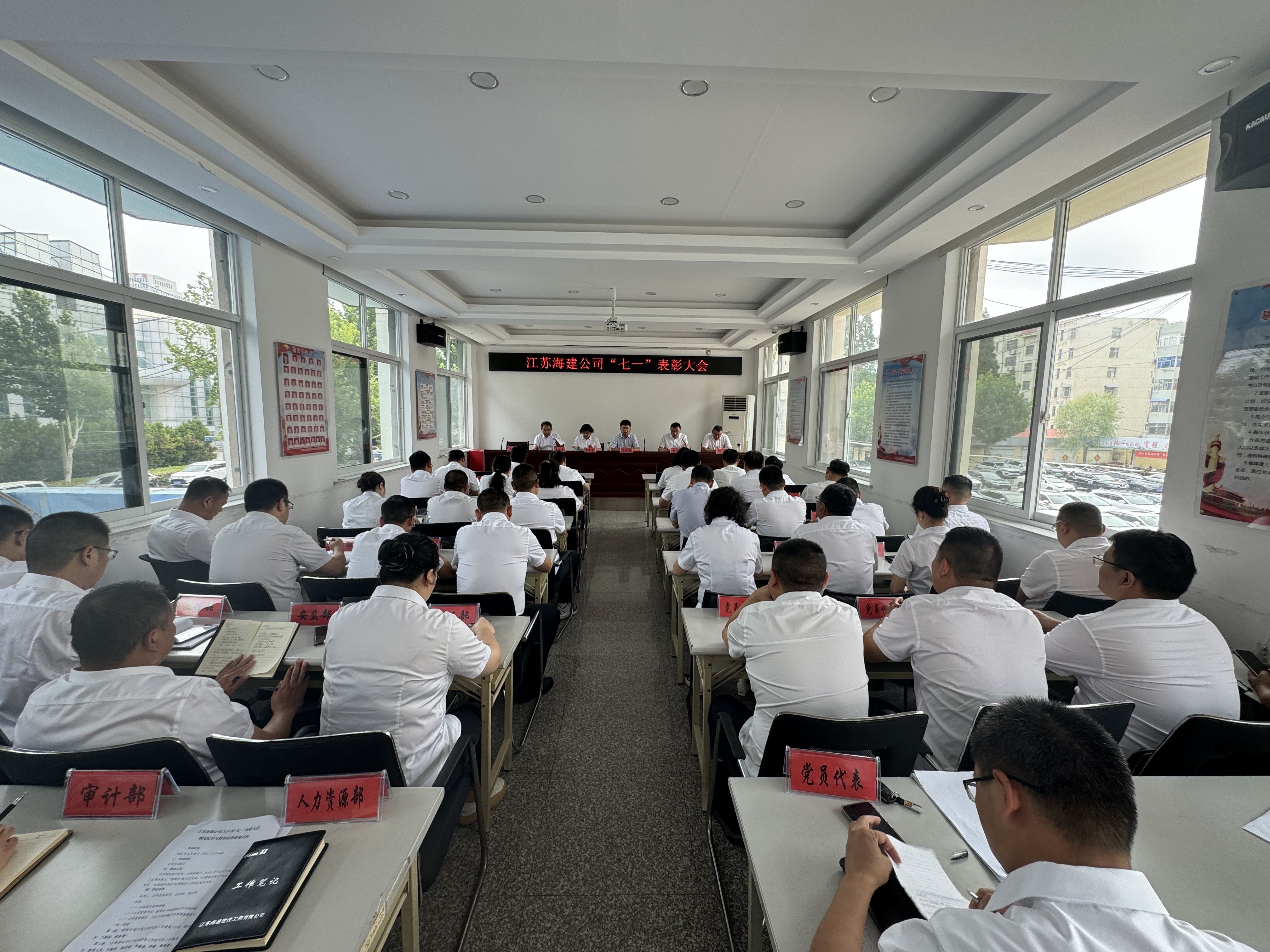 在七一建党节即将到来之际,为深入学习贯彻习近平新时代中国特色社会主义思想,充分发挥各级党组织领导核心作用、基层党组织战斗堡垒作用、广大党员先锋模范作用,江苏海建公司召开2024年“七一”表彰大会。公司领导,各部门主要负责人,各分(子)公司党政主要负责人、“雷锋车”组式党支部代表、“与雷锋车同行”优秀共产党员代表、“与雷锋车同行”优秀党务工作者代表,党员代表共48人参会。会议由党委委员总经理徐其翔主持。