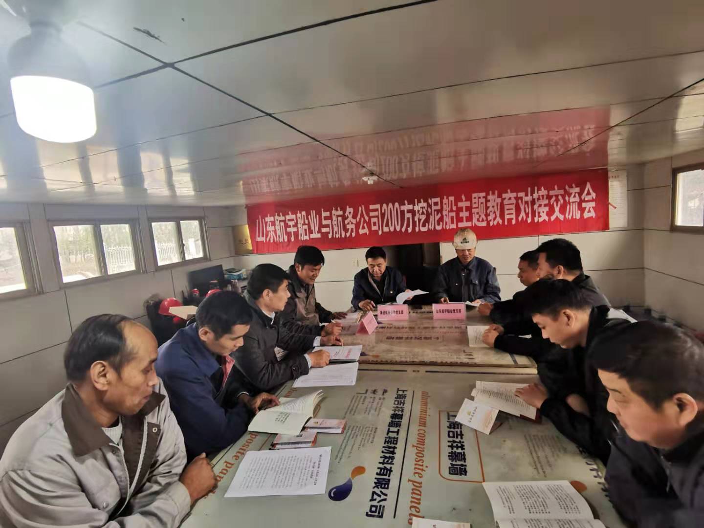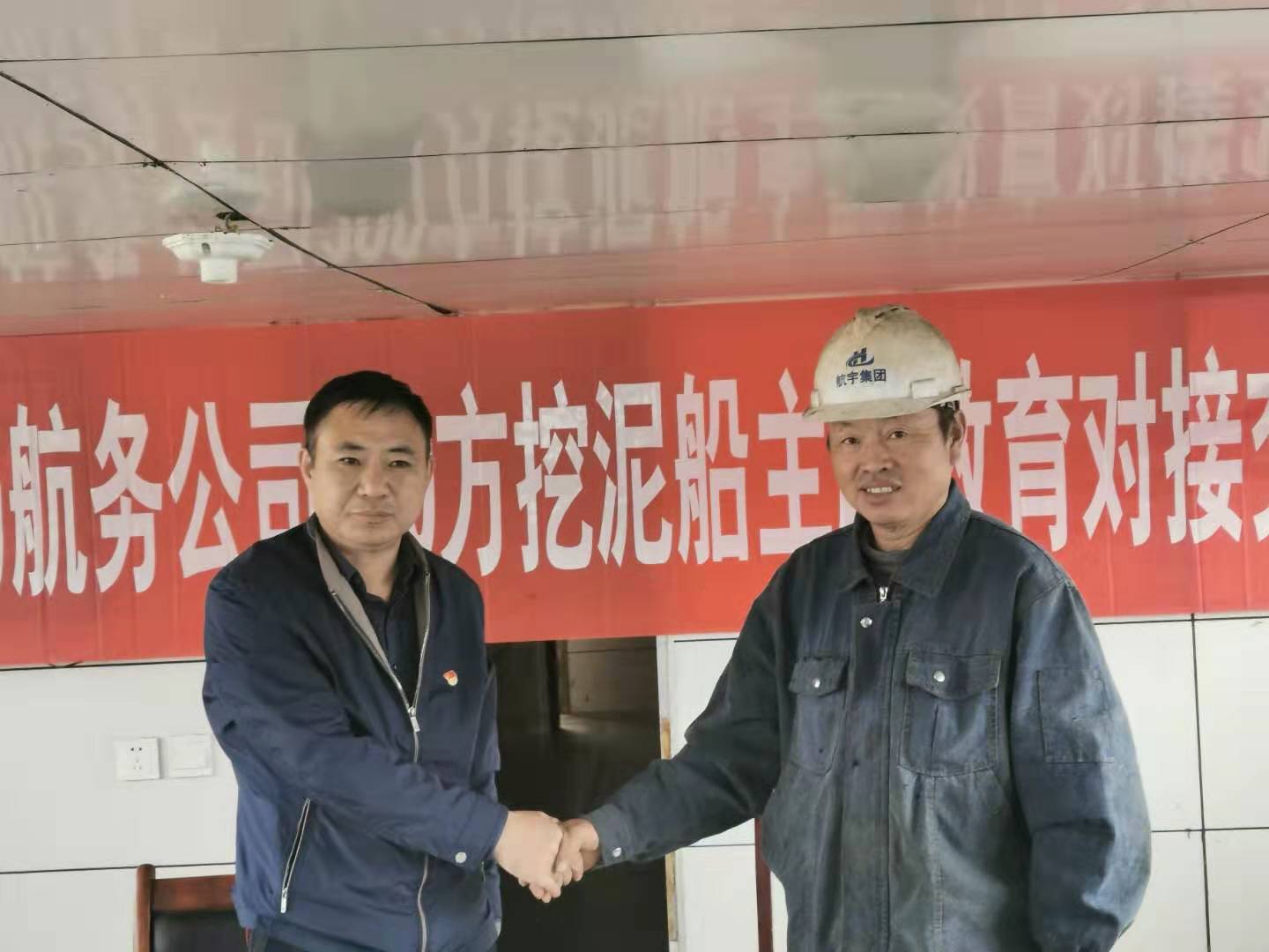 10月19日下午,航务公司与山东航宇船业在200方挖泥船就“不忘初心、牢记使命”主题教育进行对接交流。航务公司200方挖泥船因微山湖航道疏浚工程调迁至山东济宁对船舶进行船座上坞修理,为工程施工做准备。交流座谈前航务公司党支部主持工作副书记章军函拜访了山东航宇船业世界杯app最新版下载,世界杯(中国)机关领导,向航宇船业世界杯app最新版下载,世界杯(中国)学习做好主题教育的经验和方法,为做好驻厂修理200方挖泥船全体党员学习活动进行对接。航务公司部分领导班子成员、200方挖泥船全体党员、职工代表参加座谈交流。