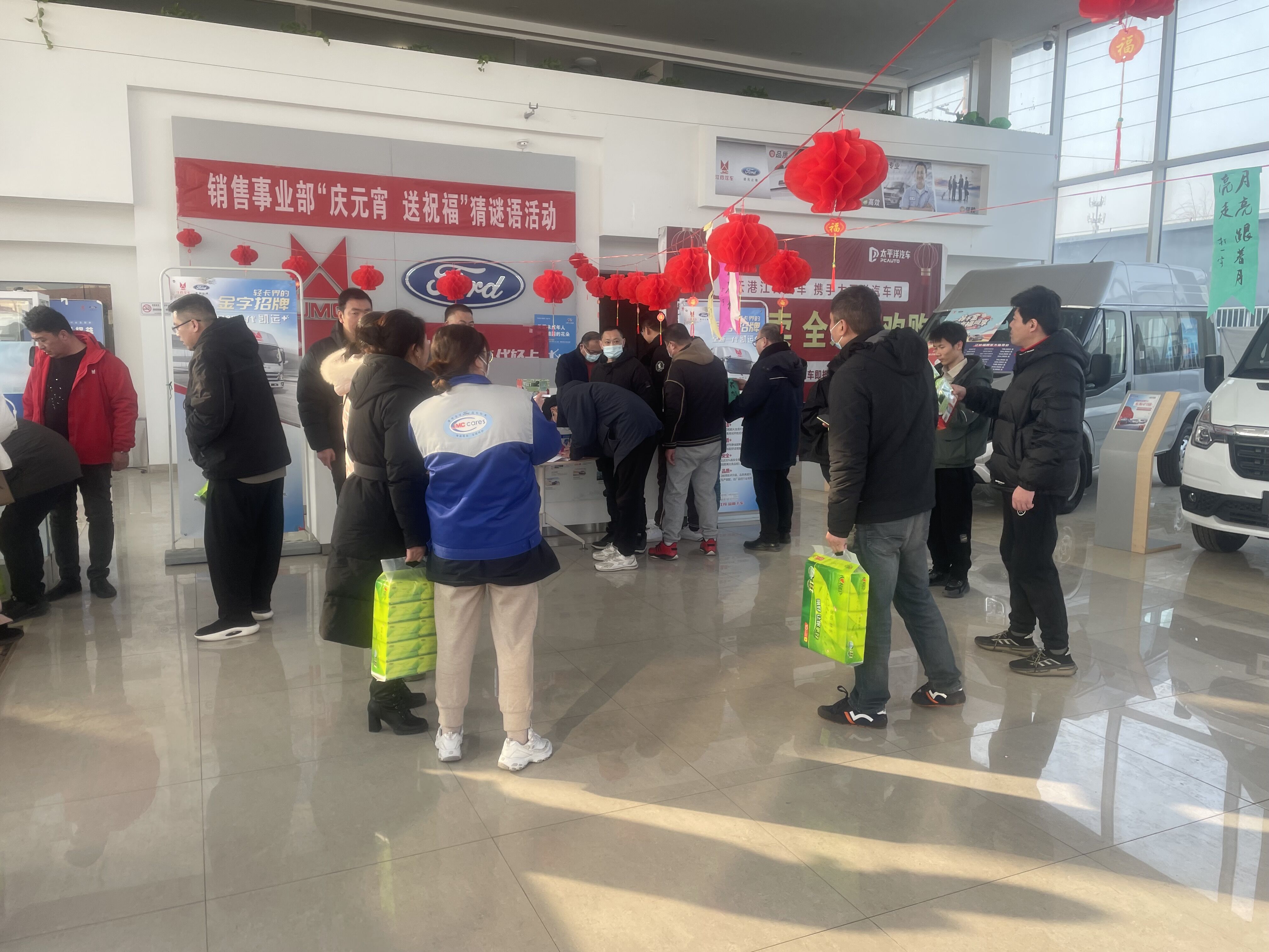 活动开始前,事业部相关人员将准备好的50多个红灯笼高高悬挂在江铃福特销售展厅的绳子上,营造出浓厚的节日氛围。明亮的大厅里,在四周悬挂的一个个红灯笼下面,系着五颜六色的灯谜卡,灯谜内容隐藏着关于中国传统节日、中国地名、汽车品牌等各种知识。前来挑战的干部职工们各个跃跃欲试、冥思苦想、互相交流,一旦想出答案,立刻兴奋地跳起身来摘下谜面去找工作人员核对,欢欢喜喜地领取一份节日小礼品。整个现场热闹非凡,欢呼声此起彼伏,灯笼下面的谜面卡,不一会儿就被摘抢一空。