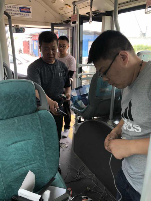 为了全力做好车辆上线运营准备工作,6月19日,市民卡公司安全信息部部长马宝浦、智慧公司技术总监林伟及智慧公交事业部技术人员,加班加点、顶着酷暑加紧安装刷卡机、报站器、摄像头,并对报站器、车内外LED显示屏进行联动调试。
