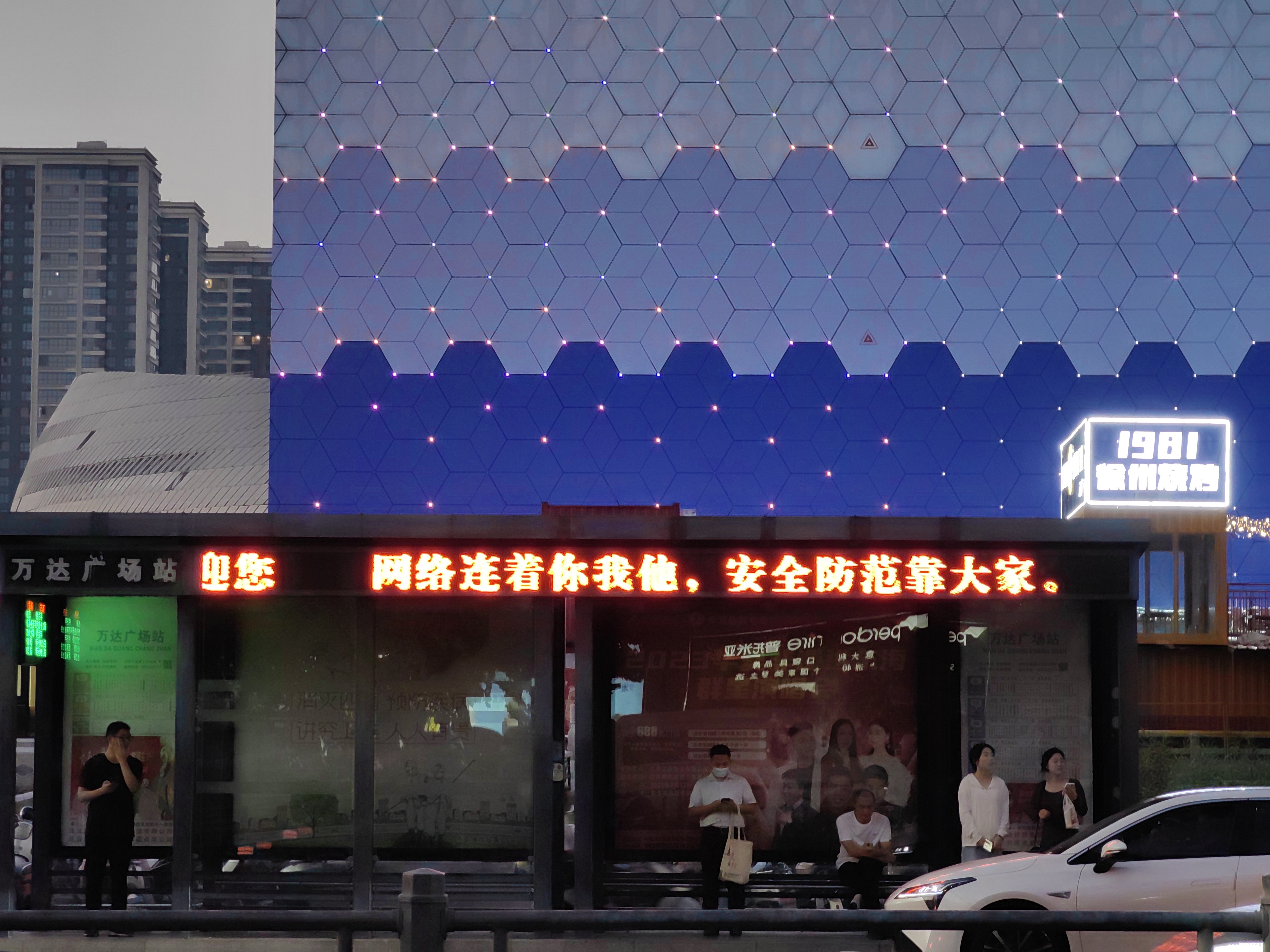 在万达广场、市政府、苍梧路等人流量较大地段的50个公交站亭设置了LED宣传语条屏