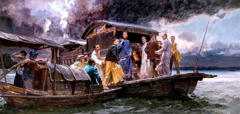 1921年7月23日,中国共产党第一次全国代表大会在上海法租界望志路106号(今兴业路76号)开幕。到7月30日晚上,本该是最后一次会议,却因巡捕的闯入被迫中止。之后,代表们转移到浙江嘉兴的南湖,在一条游船上召开了最后一天的会议。