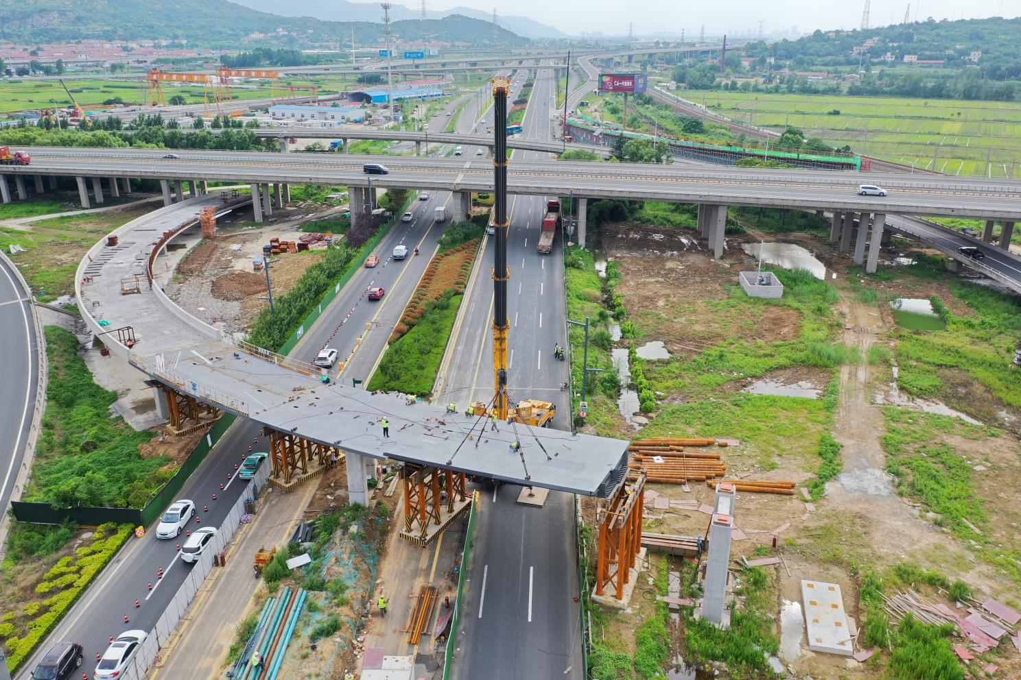 本次钢箱梁架设安装从上午十点开始,至下午五点结束,共耗时6小时。港城大道作为海州主城区与连云区连接的主要通道,交通流量非常大,为保证施工期间交通顺畅及匝道纵坡下部净空,通过工程方案比选,采用钢箱梁施工工艺,相比现浇混凝土箱梁所需的至少一个半月工期,钢箱梁采用工厂化生产,托运到现场后,配合使用临时支墩法架设,吊装就位进行拼装焊接,仅需两个半天即可完成,有效的减少了对施工港城大道车辆通行的影响,避免了交通拥堵。该段施工横跨港城大道61米,吊装钢箱梁7片,箱梁架设并完成桥面施工后,将实现宽10米的单向双车道匝道通行能力。