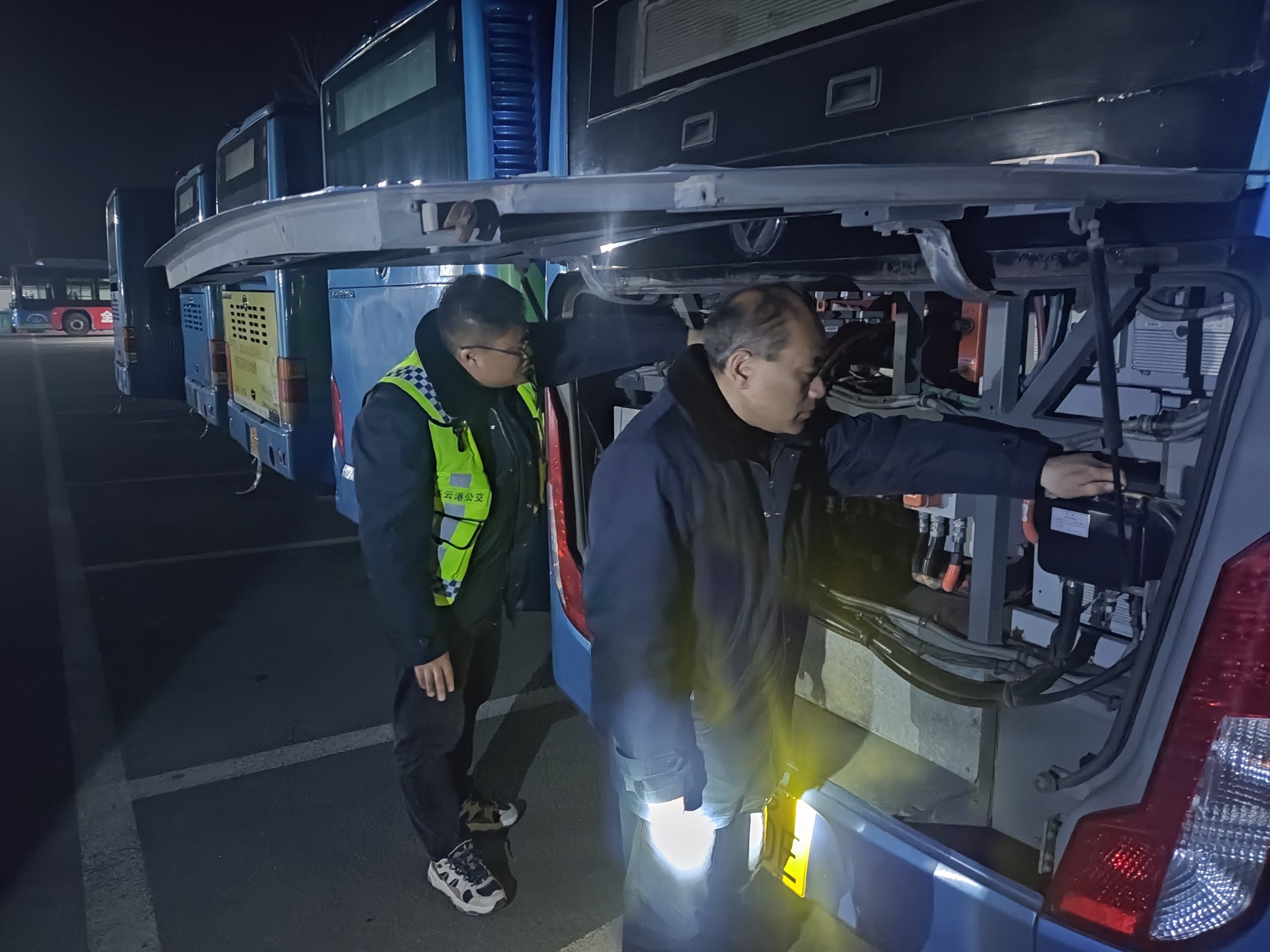 夜查行动特别关注以下关键环节:一是车辆安全检查。确保所有车辆按照规定标准停放,并仔细检查车内安全设施设备是否齐全、功能完好。同时,检查所有车门窗是否完全关闭,以及总电源和燃气阀门是否已妥善关闭,保障车辆处于安全状态。二是场站安全巡查。检查场站消防通道、消防设施管理及应急物资储备情况,夜间安保人员在岗及履职情况、为突发事件做好准备。三是驾驶员安全交代。对夜班线驾驶员进行随机抽查,评估他们对安全职责和应急措施的熟悉程度,并强调夜间行车安全,提醒避免疲劳驾驶和违规操作,确保每一位驾驶员都能以饱满的状态值好每一班岗。