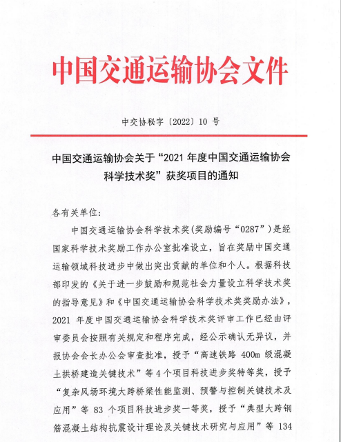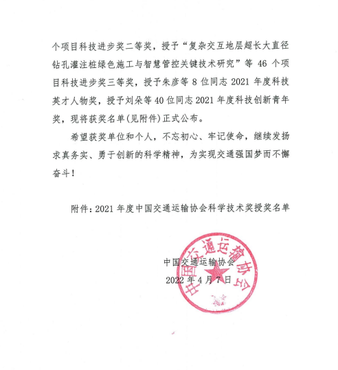 近日,中国交通运输协会发布了“2021年度中国交通运输协会科学技术奖”获奖项目名单,交通世界杯app最新版下载,世界杯(中国)联合苏交科世界杯app最新版下载,世界杯(中国)等单位申报的“江淮地区融冰降噪桥面铺装磨耗层关键技术应用研究”项目荣获中国交通运输协会科技进步奖二等奖。