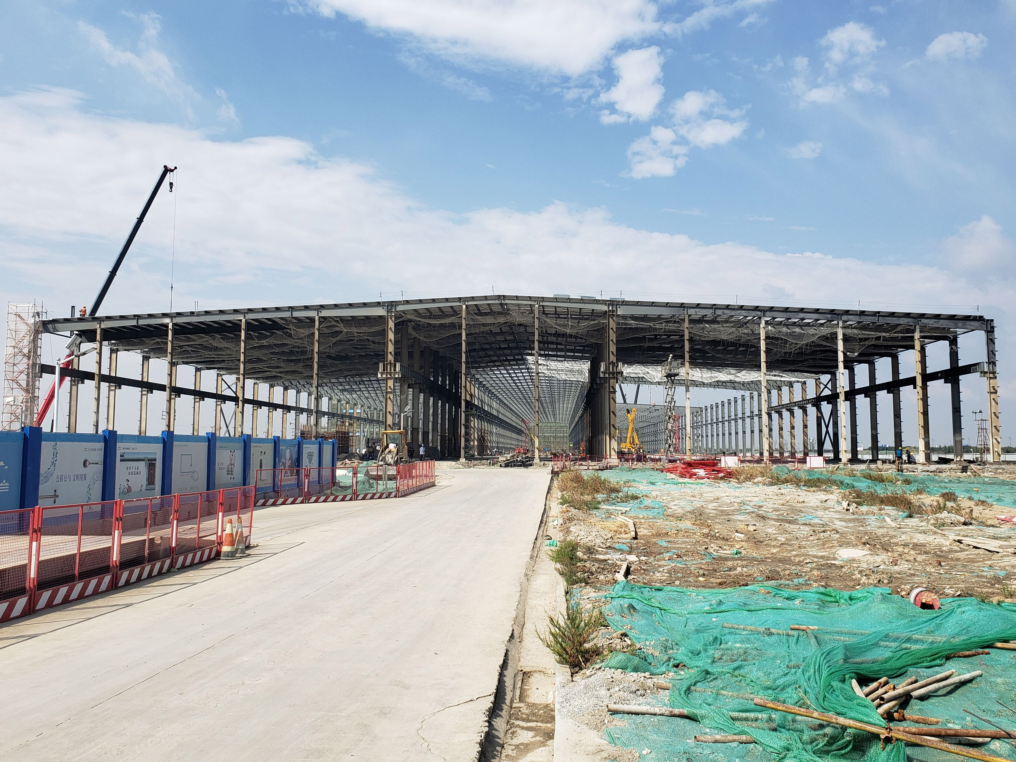 钢结构安装、防火涂料喷涂、屋面板安装等各项工作均同步施工。截至当前,车间主钢构吊装进度已完成90%,主檩条安装进度已完成50%,屋面底板正陆续开始安装。与此同时,综合楼和车间附属楼正在进行二次结构施工。
