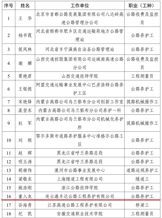 近日,交通运输部公布2021年度全国交通技术能手评审结果,连云港市交通控股世界杯app最新版下载,世界杯(中国)丰达养护公司公路养护工董入龙同志荣誉“全国交通技术能手”称号。据悉,全国仅有245名同志获此荣誉。