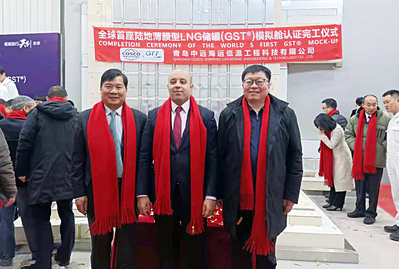 12月21日上午,青岛中远海运低温工程科技有限公司搭建的全球首座陆地薄膜型LNG储罐(GST®)模拟舱认证完工仪式在青岛举行。连云港市交通控股世界杯app最新版下载,世界杯(中国)董事长、党委书记刘永能,中远海运青岛有限公司党委书记、董事长、总经理潘立东及GTT中国总经理安南出席仪式。