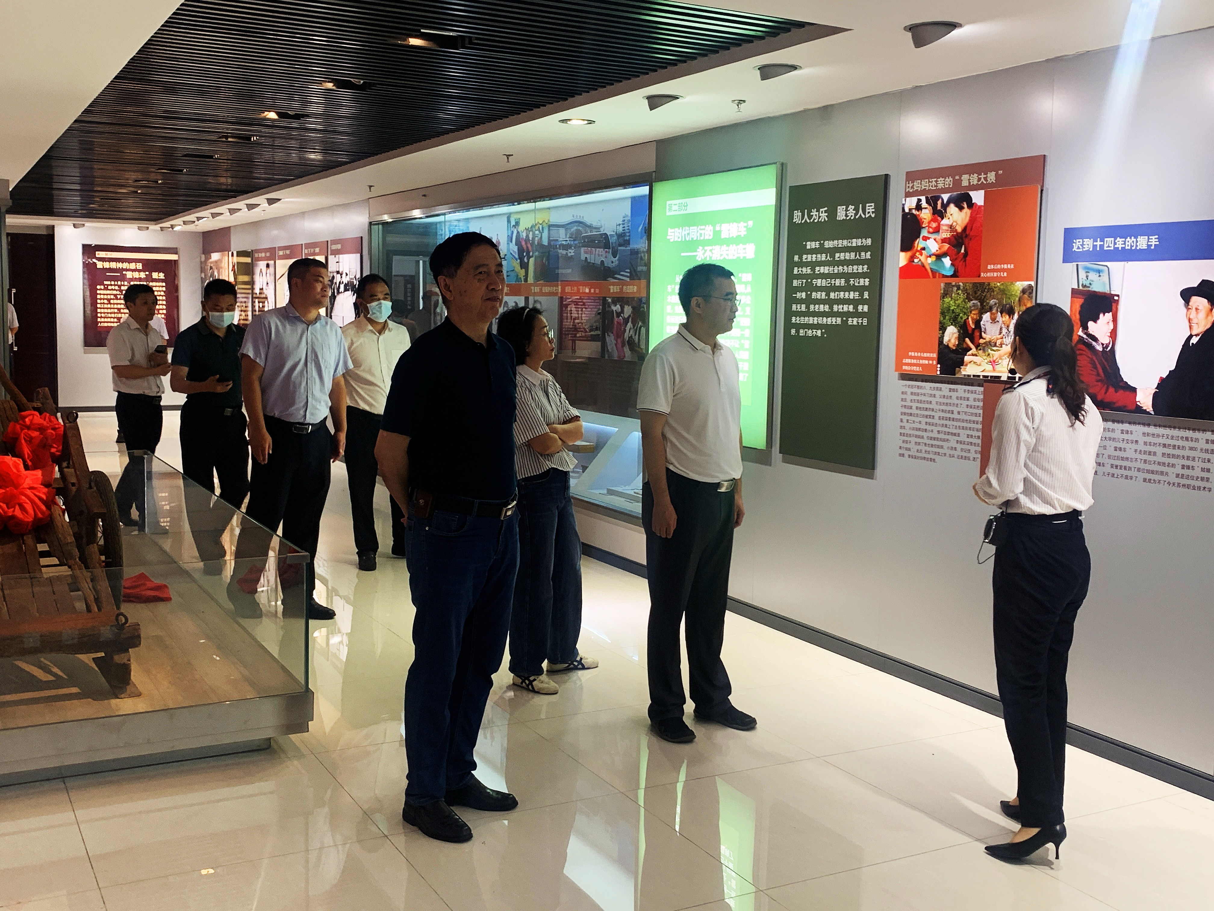 专家组一行实地查看了雷锋车事迹陈列馆,雷锋车驿站、雷锋车手工作室,在雷锋车事迹陈列馆内,专家组饶有兴致地观看老照片、实物、影像等资料,认真聆听陈列馆讲解员的介绍,深入了解了“雷锋车”组59年如一日全心全意为旅客服务的先进事迹。在雷锋车驿站,驿站工作人员向专家组介绍了驿站旅客的日常接待和志愿服务工作。专家组不时和陪同人员交流,询问具体细节情况。