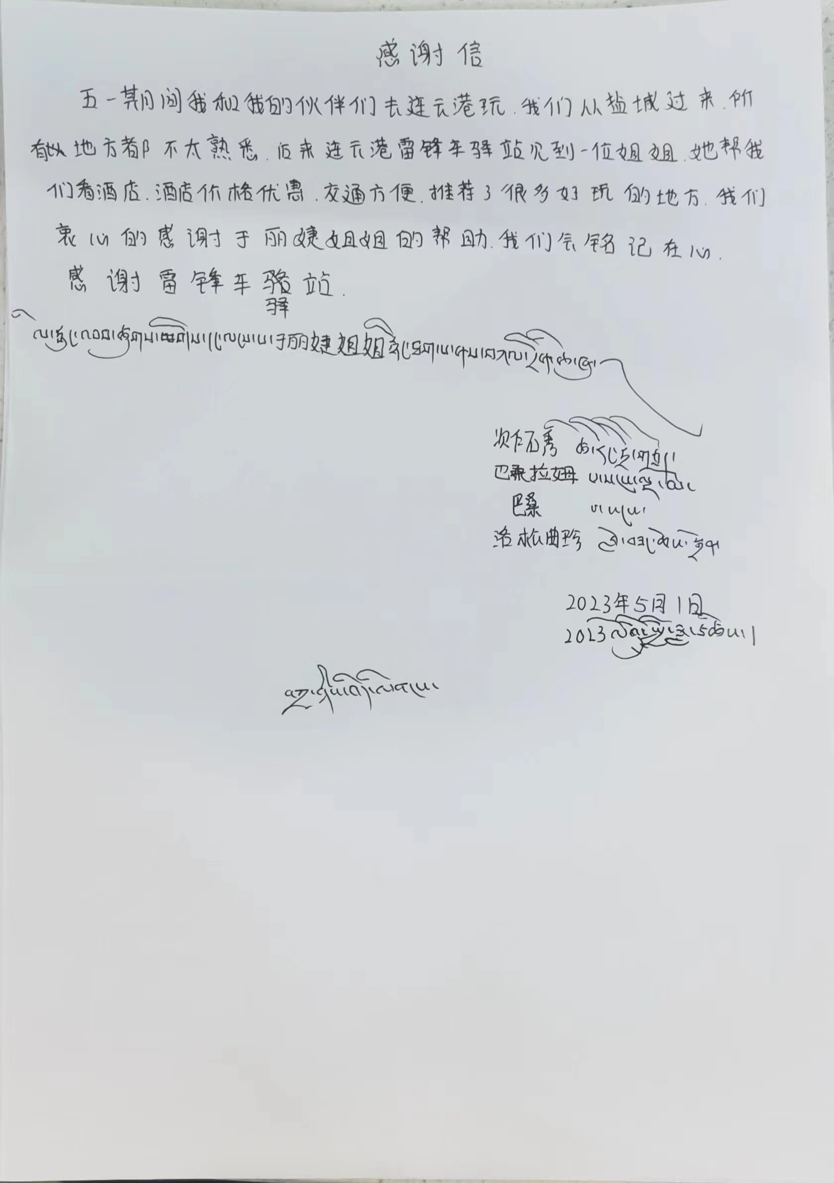 5月1日,连汽“雷锋车”驿站收到了一封手写的感谢信。写感谢信的是四位外地来连游玩的大学生,她们在信中对“雷锋车”驿站的志愿者于丽捷热情、友爱、助人的工作作风深表谢意。感激之余,四位大学生写下了这样一封感谢信。