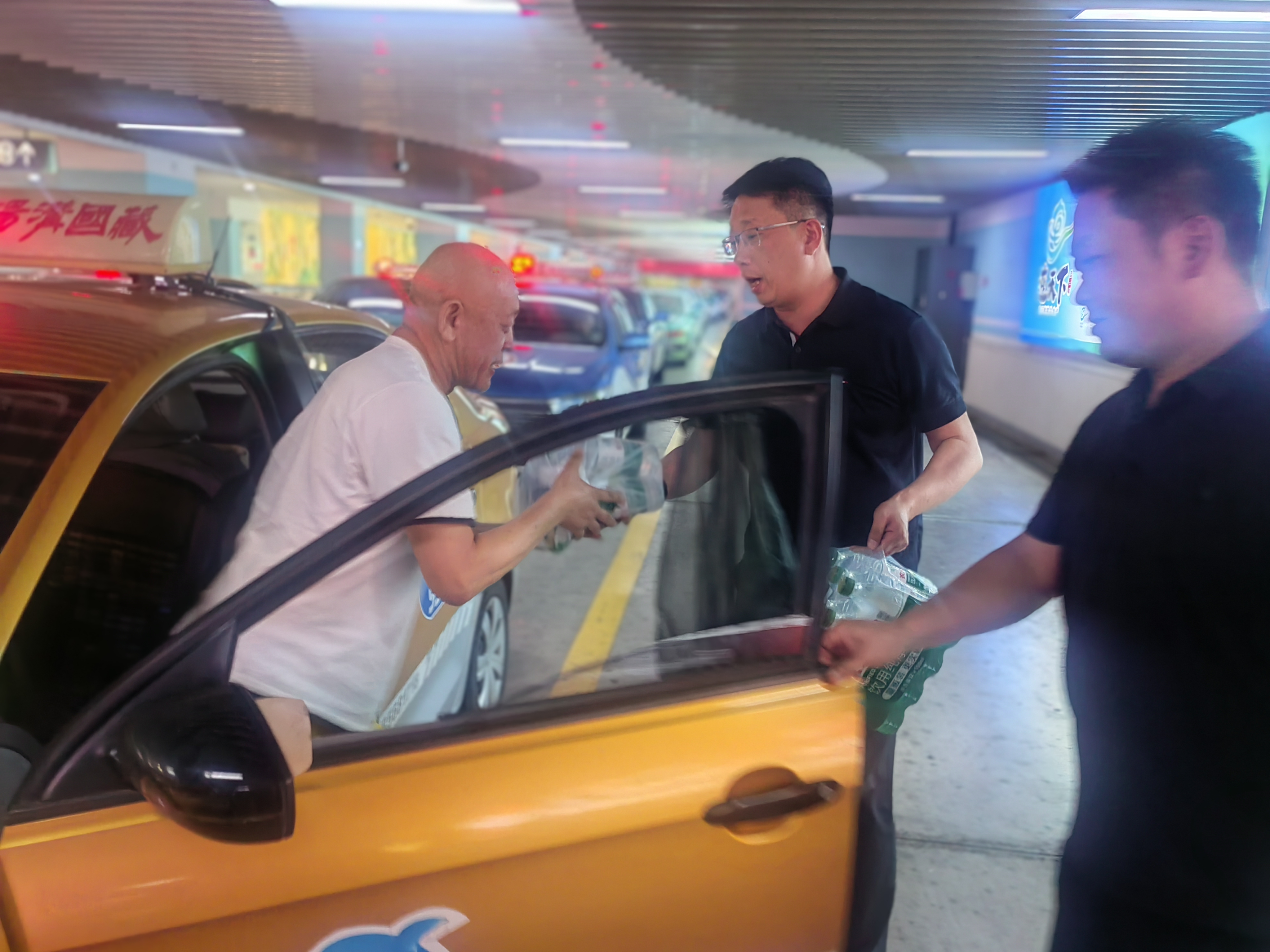 近期,我市连续多日持续高温高湿,给每天穿梭在道路上的出租车驾驶员们带来很大的考验,为确保一线驾驶员在酷暑中保持良好的工作状态,为乘客提供更加优质的服务,8月12日,由市出租汽车协会会长鞠仕亮及公司负责人组成的“送清凉”小组来到高铁站出租车密集上客区,为汽服公司出租事业部停靠候客的出租车驾驶员们送上了矿泉水、毛巾、香皂、风油精等清凉用品,给坚持在暑运一线的出租车驾驶员们送上一份清凉。