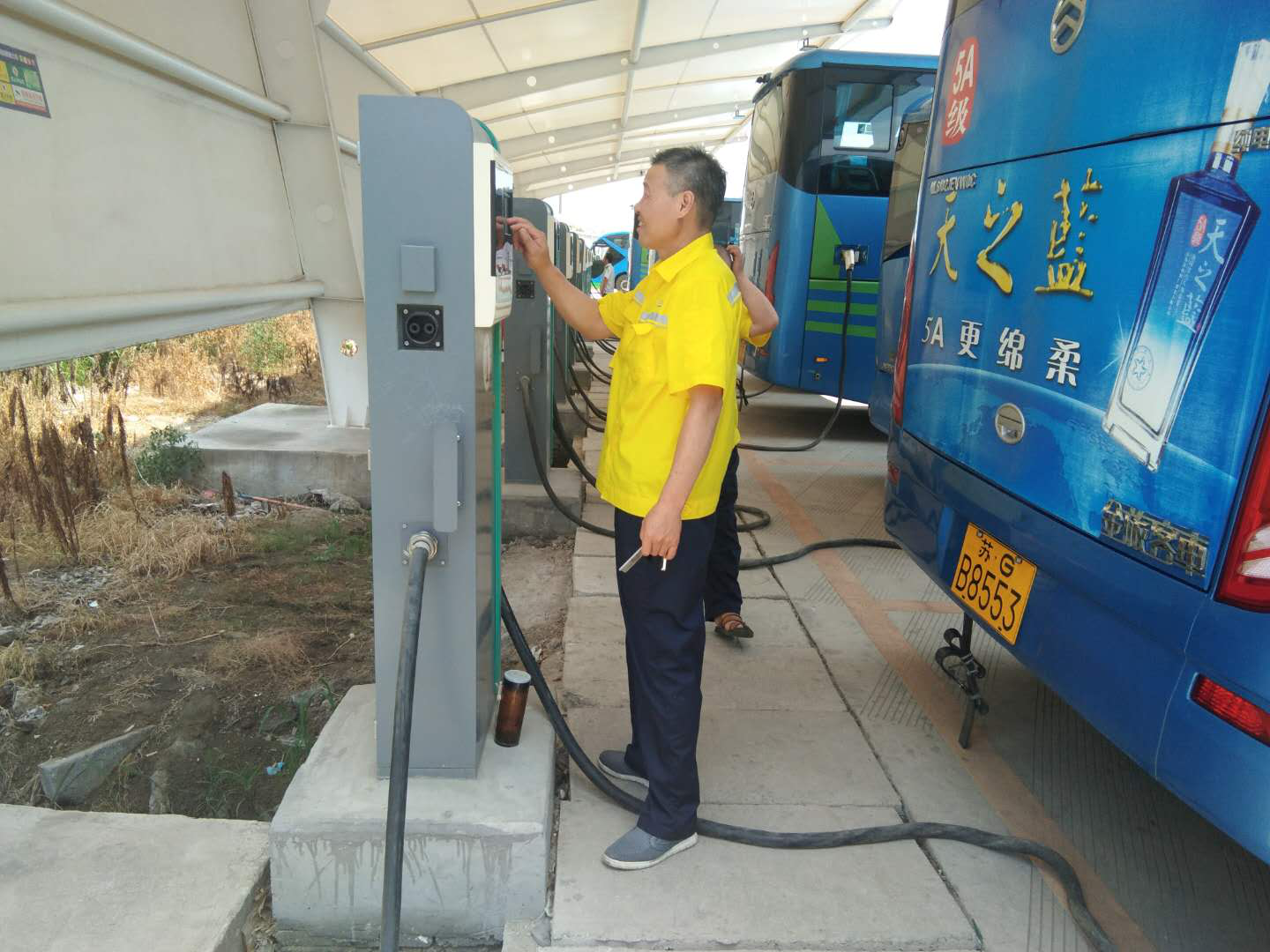 江化北路充电场站目前有10个充电桩,每天来这上班的充电工最大年龄59岁,平均年龄都在55岁以上,但是他们年岁虽老而心志犹壮,一年四季顶着烈日严寒在室外工作,早上6点到岗,夜里24点下班,没有舒适的座椅,没有凉爽的风扇,每天面对单调,重复,枯燥的工作挥洒汗水,或许他们一身的汗味,没有人愿意靠近,但他们却从不言苦,不言累,而是凭着对工作的热爱,传承着爱岗敬业的精神,他们为了让更多的人能够及时坐上公交车平安出行,每天一如既往地坚守在充电站,尽职尽责,为新能源公交车补充电量。他们的工作服干了又湿,湿了又干,他们的肤色黑了一层,脱了一层,远看像关公,近看才是充电工。但是他们,却用久经验的行动在诠释自己,他们在为公交车充电,同时也在为自身充电",他们几个人的心往一处想,劲往一处使,平时他们认真学习公司的规章制度,提高自己的职业道德和技术技能,定时巡查设备运行是否正常,利用充电空隙时间清扫场地,从未因为个人原因而影响工作和机器的正常运行,遇到突发情况他们也是想方设法排除。