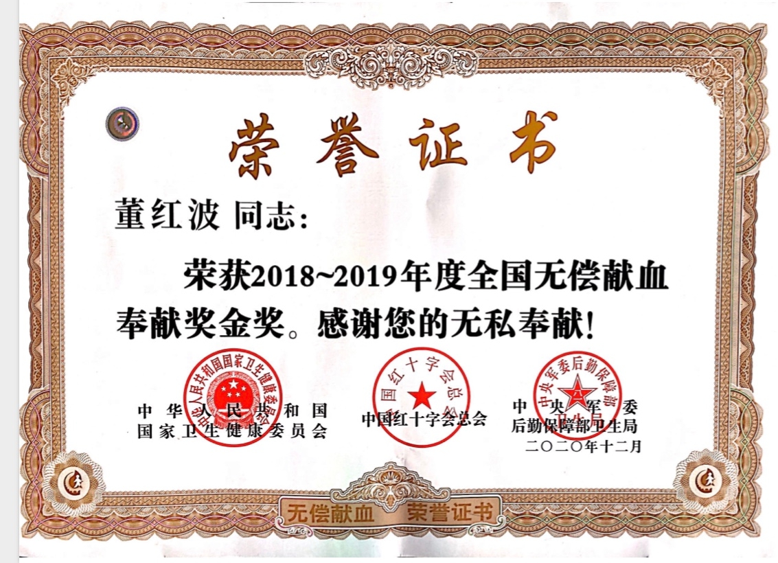 采集生命之火,点亮生命曙光。董红波同志从2002年开始献血至今献血总量已有11900毫升,不仅自己一直坚持无偿献血,还常常动员身边的同事和朋友加入到无偿献血行列中,董红波说“社会需要正能量的传递,无偿献血是每个健康公民应尽的责任,我会一直坚持参加无偿献血,捐一份热血,献一片爱心,用实际行动奉献自己的一片爱心,为构建健康中国贡献自己的一份绵薄之力”。