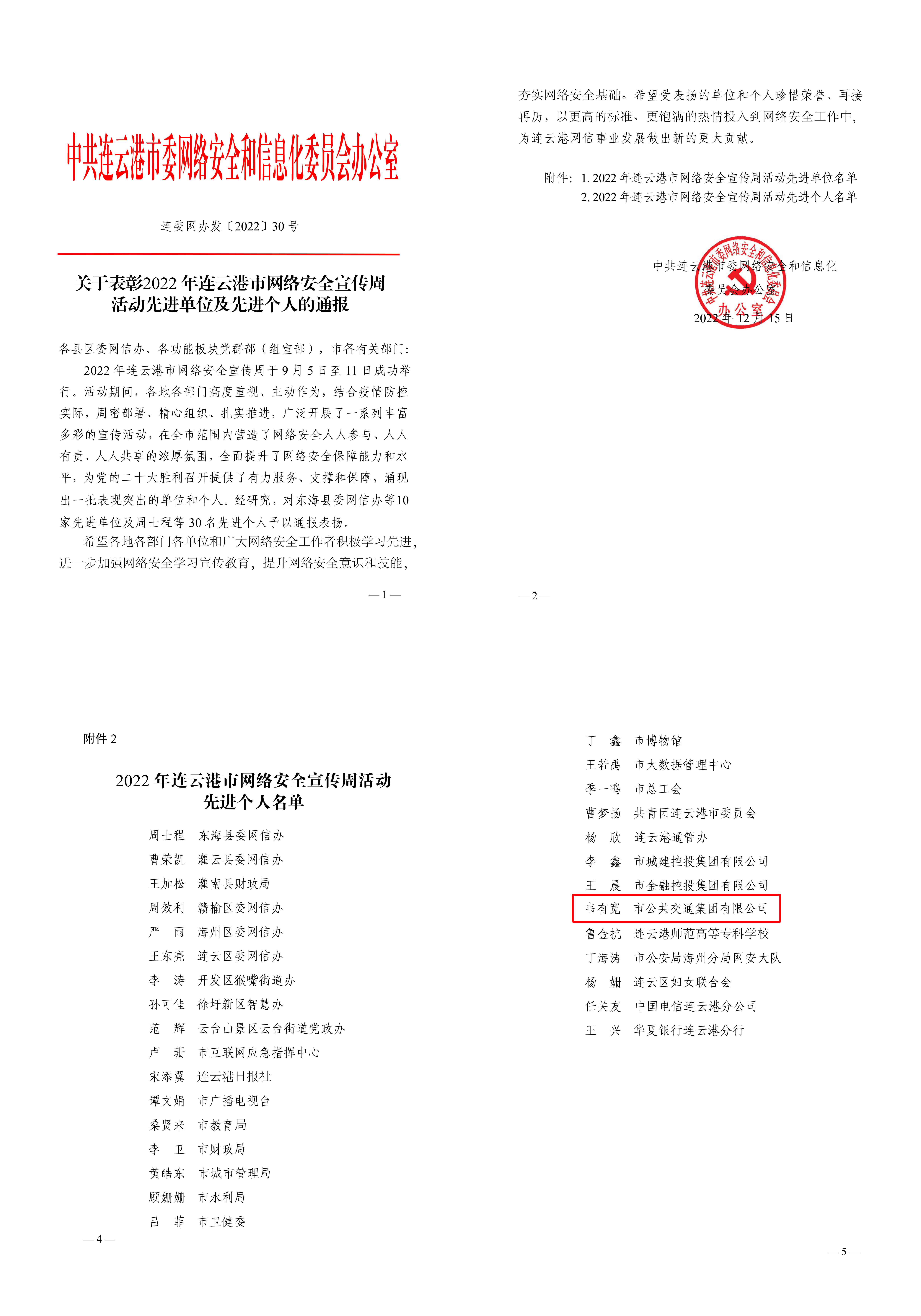 2022年连云港市网络安全宣传周于9月5日至11日成功举行。活动期间,市交通控股世界杯app最新版下载,世界杯(中国)权属公交世界杯app最新版下载,世界杯(中国)高度重视,主动作为,广泛开展宣传活动,营造网络安全人人参与、人人有责、人人共享的浓厚氛围。公交世界杯app最新版下载,世界杯(中国)生产运营部韦有宽在宣传活动中表现突出,获得连云港市网络安全宣传周活动先进个人荣誉称号。