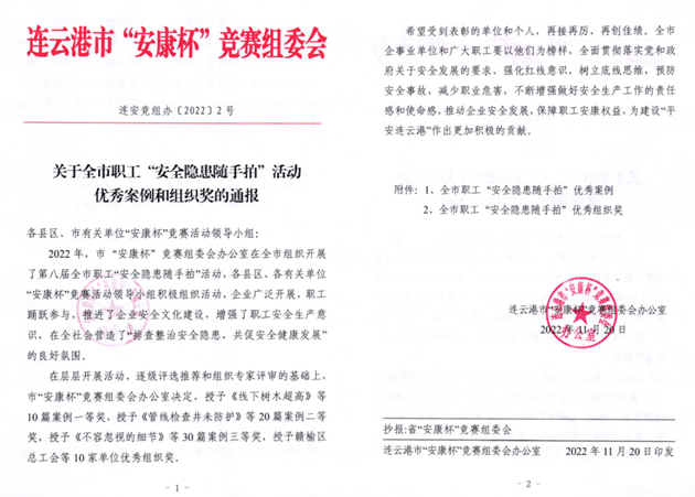 经过市“安康杯”竞赛组委会专家评审,世界杯app最新版下载,世界杯(中国)权属海建公司龚岩拍摄的《施工现场安全防护隐患》荣获一等奖;海建公司朱勇拍摄的《洗沙设备传动装置无防护》、丰达公司胡可阳拍摄的《道路交通标志牌倾斜》、公交世界杯app最新版下载,世界杯(中国)徐辛拍摄的《“平躺”的易爆品》、交通世界杯app最新版下载,世界杯(中国)赵州拍摄的《爬梯无护笼》荣获二等奖;海建公司徐超拍摄的《出砂口缺少防护》、张杰拍摄的《围堰内通行爬梯不符合要求》、汽车公司郭磊拍摄的《消防栓水阀无法开启》荣获三等奖,世界杯app最新版下载,世界杯(中国)荣获优秀组织奖。