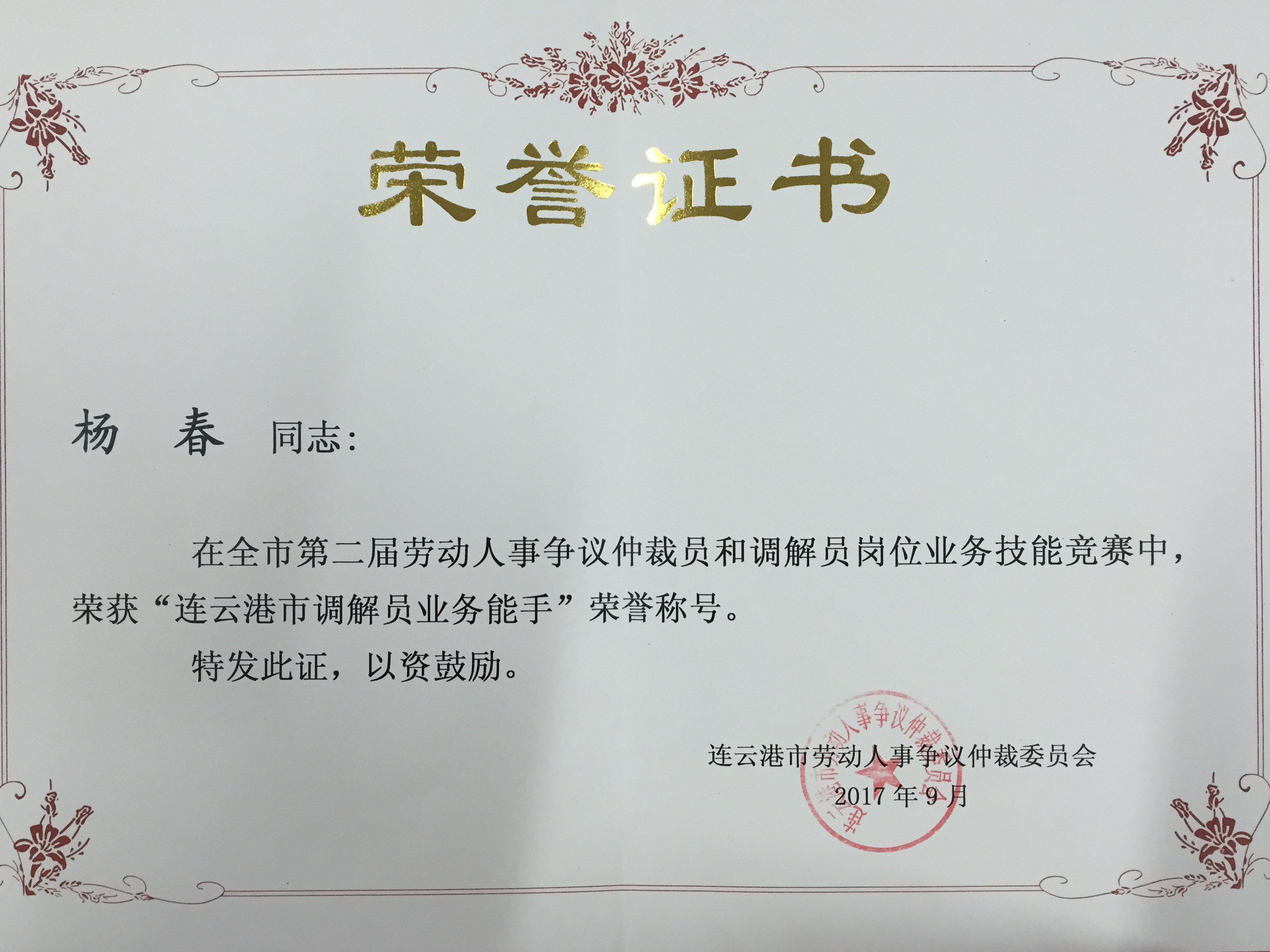 9月,航运公司杨春同志在连云港市第二届劳动人事争议仲裁员和调解员岗位业务技能竞赛中获得“连云港市调解员业务能手”荣誉称号。该项技能竞赛由市人力资源和社会保障局、市总工会、市劳动人事争议仲裁委员会共同组织举办,共50多名选手参加第二届劳动人事争议仲裁员和调解员岗位业务技能竞赛。经过笔试和面试的综合成绩评选,前十名的仲裁员和调解员获得荣誉证书。竞赛以促进我市和谐劳动关系的构建为出发点,鼓励广大人力资源工作从业者、工会工作者,积极主动学习相关劳动法律法规,不断提高职业素养和业务水平。
