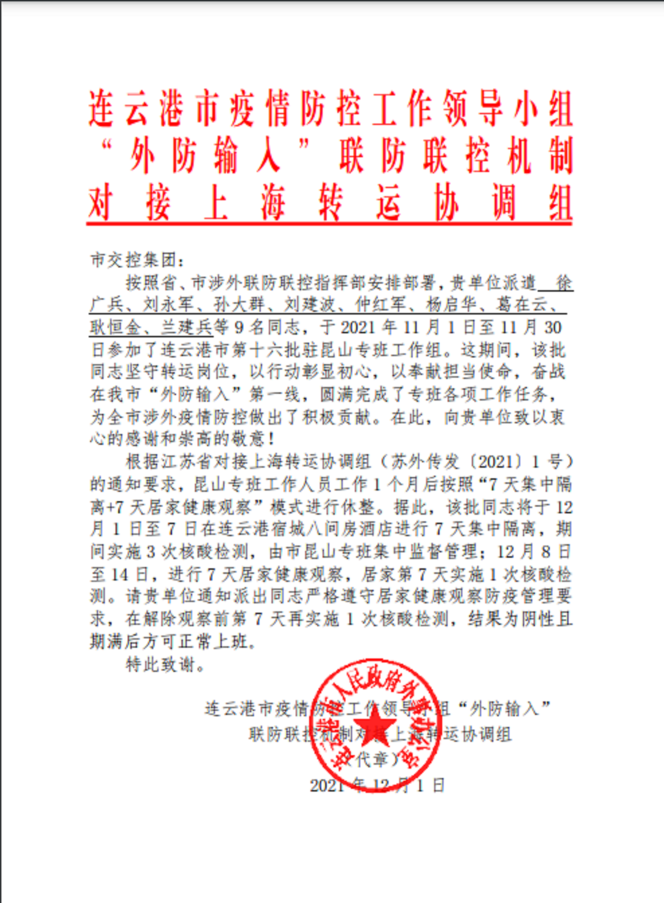 12月1日,连云港市疫情防控工作领导小组“外防输入”联防联控机制对接上海转运协调组发来感谢信,对连汽客运事业部驻昆山专班工作组的驾驶员认真负责的态度和精湛驾驶技术给予高度评价,并表示了由衷的感谢。