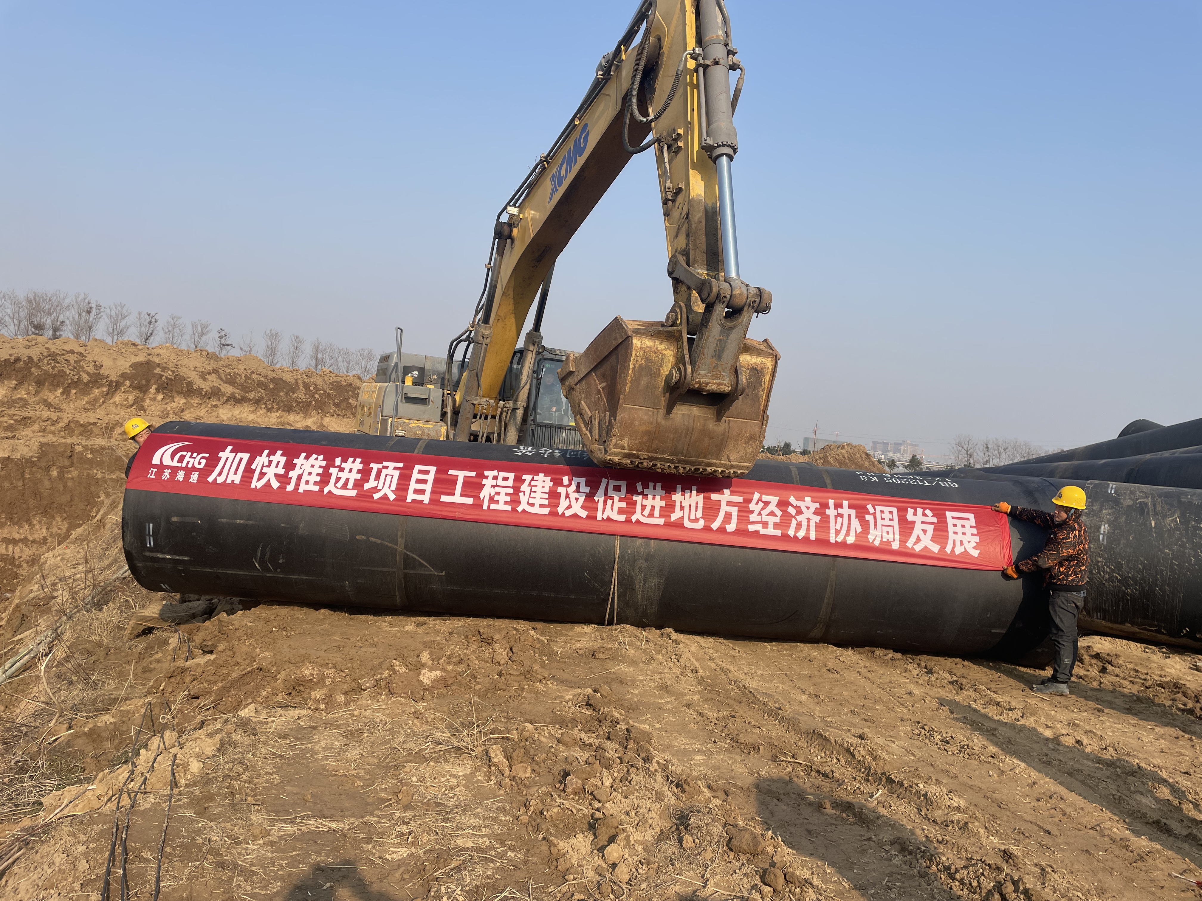 该球墨铸铁管公称直径DN1600,管节长度8.15米,每根重量约5吨,使用470大型挖机在开口线1.5米以外平地上吊装。此次球墨铸铁管安装作为引江济淮输水管道首节球墨铸铁管安装,项目部精心组织策划,积极组织协调,制定安全可靠的专项施工方案,对吊装使用的机械、工器具和安全防护用品细致检查,保证各项安全措施到位,确保首吊工作能够安全顺利进行。项目部自11月底开工以来,全面贯彻落实公司工作会议精神,积极落实精细化管理“提质增效”行动,有序组织安全生产,保持艰苦奋斗、勇于担当的作风,不等不靠,主动协助业主单位推进征地拆迁进度,为项目的全线开工不懈努力,全力打好年度施工产攻坚战。