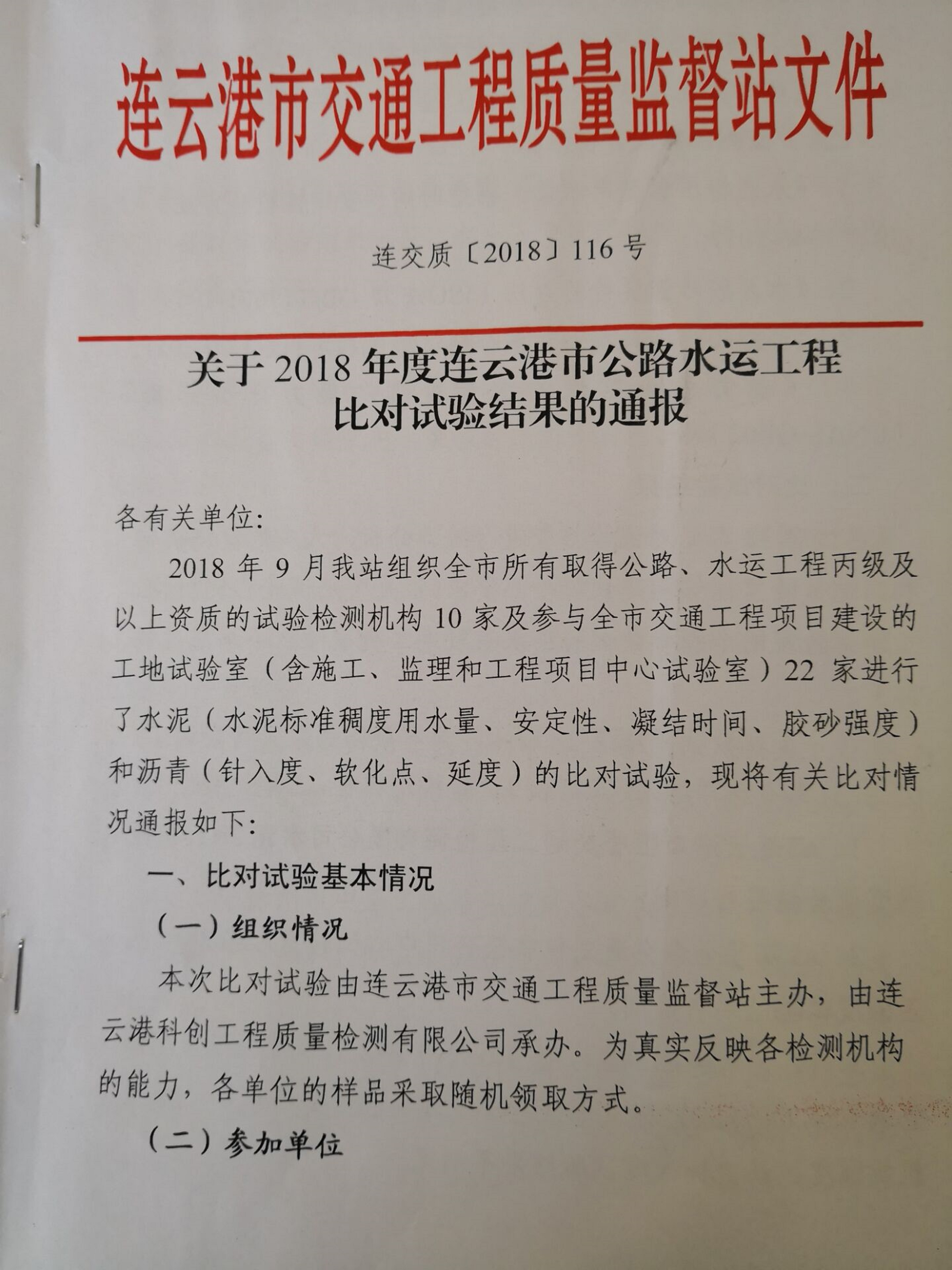 新丝路检测公司试验人员从“人员、设备、材料、方法、环境”机经过认真积极的准备,一丝不苟的试验操作,圆满的完成了此次比对活动.2018年11月,根据连交质〔2018〕116号文件关于此次比对试验结果的通报,新丝路检测公司在此次比对活动中,水泥和沥青7个参数均满意结果,水泥总体评判“优良”,沥青总体评判“优秀”。