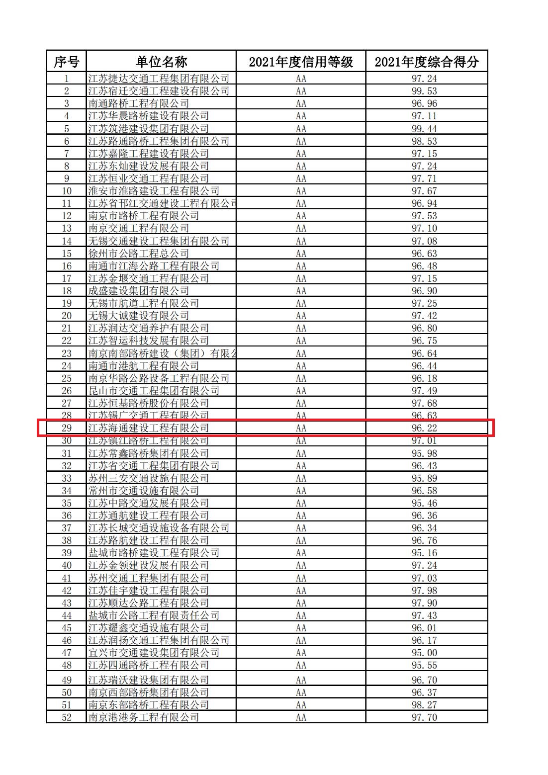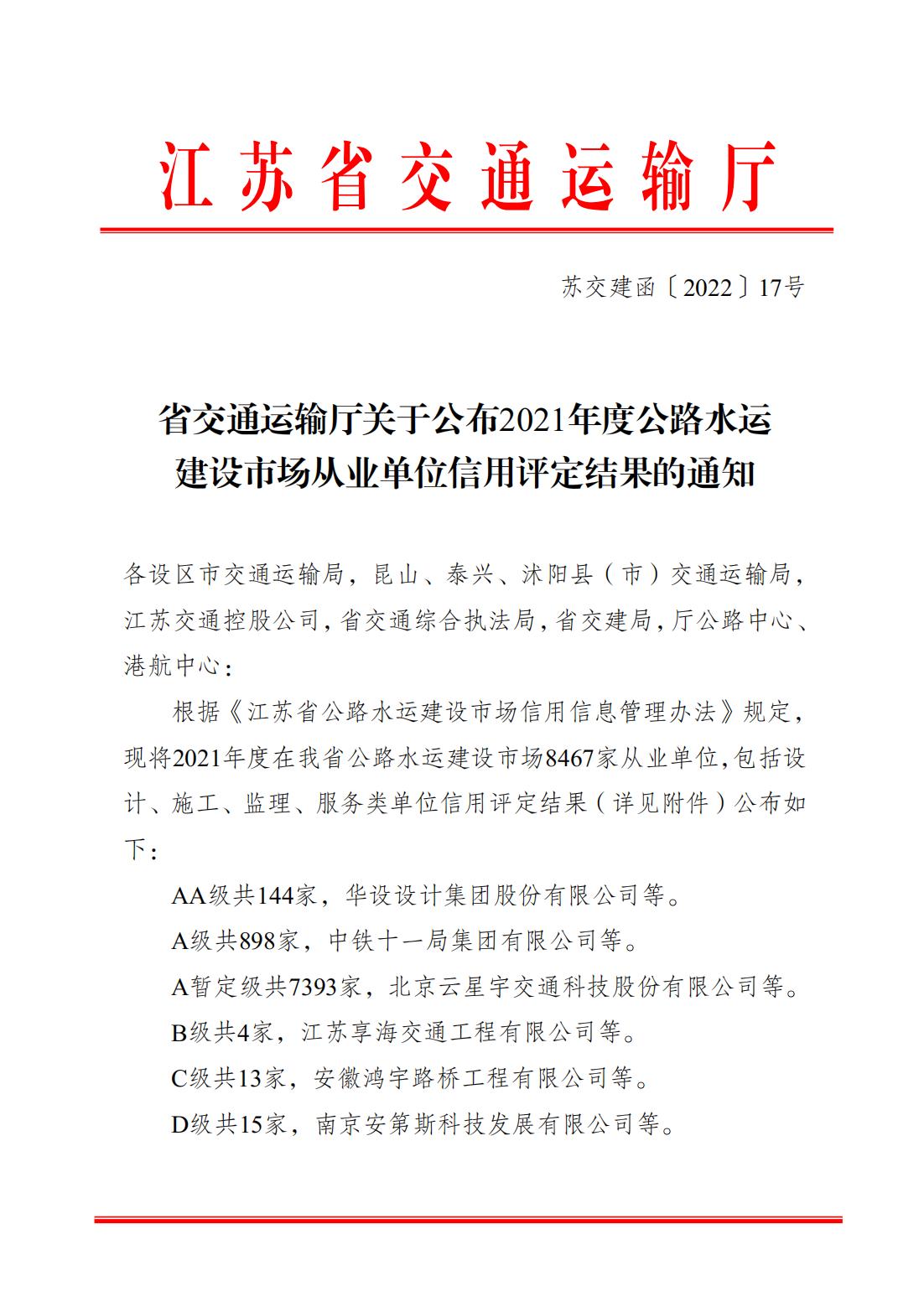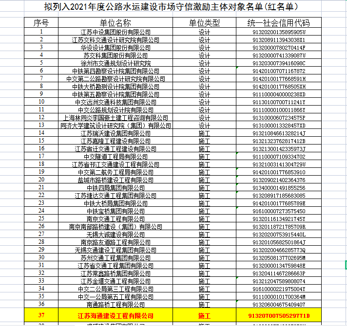 近日,从江苏省交通运输厅相继公布的2021年度公路水运建设市场从业单位信用评定结果》和《2021年度公路水运建设市场守信激励和严重失信主体对象名单》文件中获悉,江苏海通建设工程有限公司2020年度、2021年度连续两年被评定为江苏省公路水运建设市场“AA”信用单位,并进入江苏省公路水运建设市场守信激励单位名单(“红名单”),这是本企业成立以来获得的最高信用评价,也是连云港市唯一获此两项殊荣的公路水运施工企业。