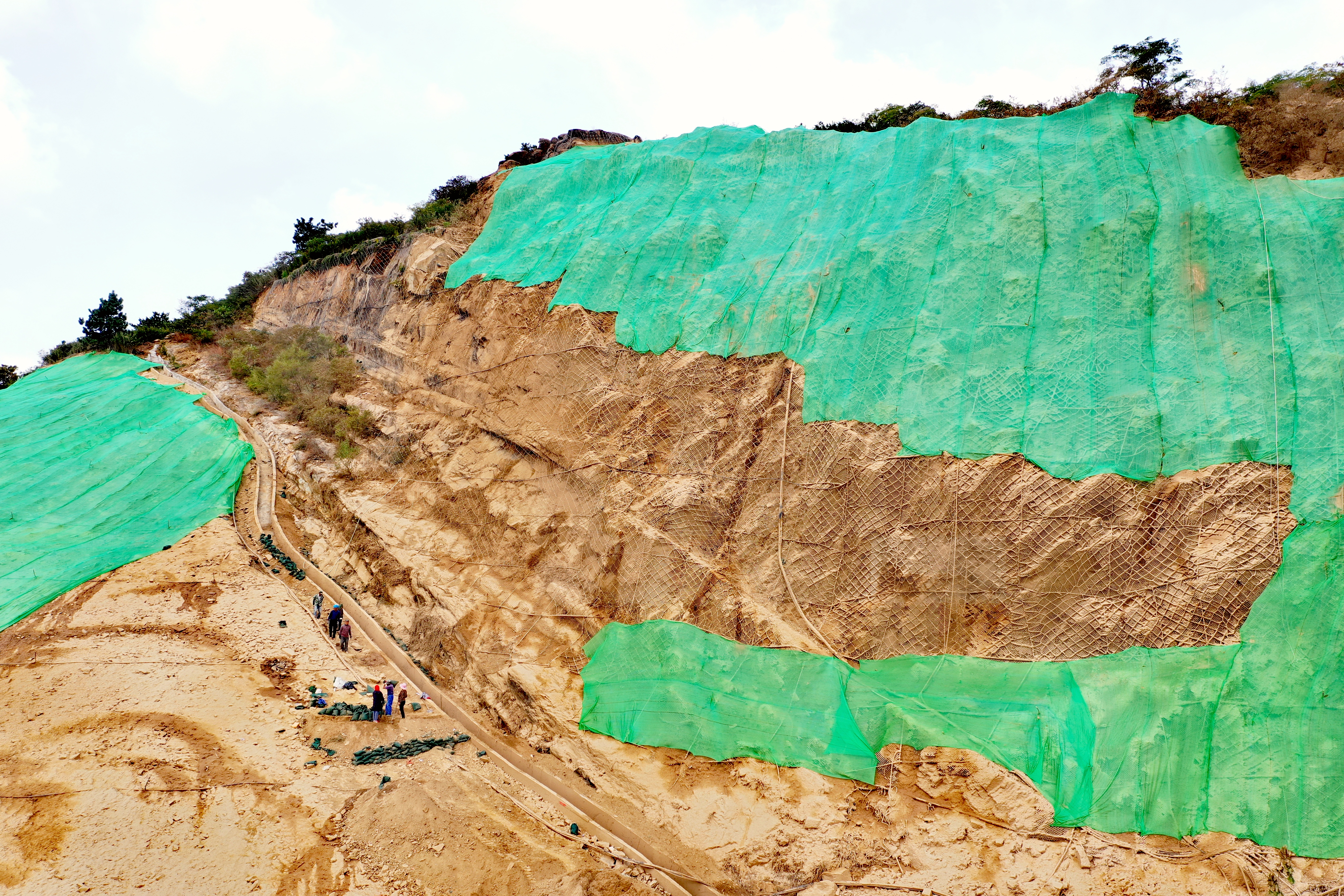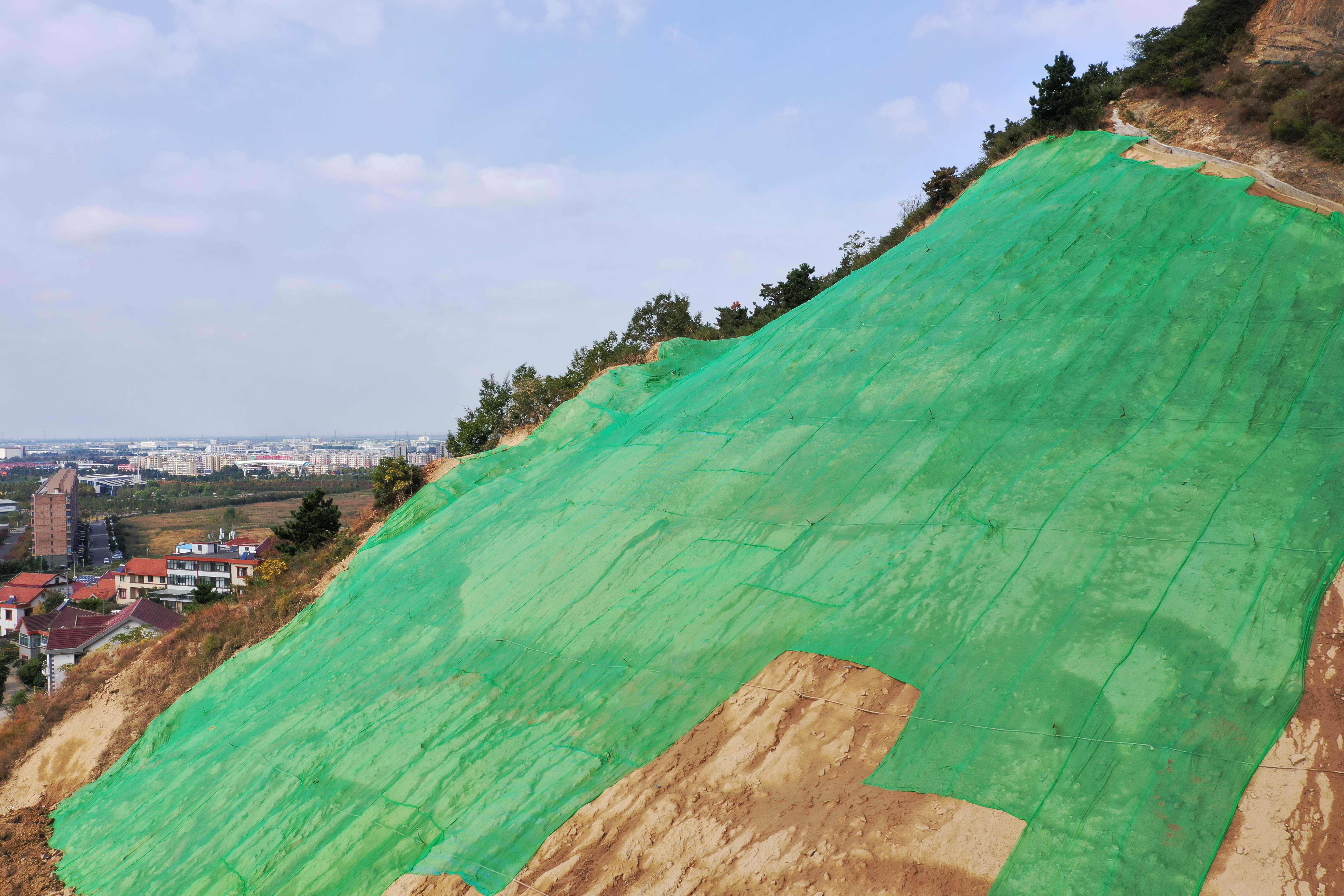 目前,工程已完成山体削坡减载、回填压脚、挡墙砌筑施工,排水通道及绿化养护蓄水池也已建设完成。绿化工程施工正在全面展开,其中裸露岩石快速植被恢复方式是喷播覆绿技术,即在岩壁上喷洒10cm左右的土壤、保水剂和植物种子,让其自然生长,可实现岩壁永久绿化。该项工作已完成80%,后续开展乔木种植,全部绿化施工预计11月初完成,将有效提高山体的植被覆盖率,消除边坡地质灾害,大幅改善周边的自然地形地貌景观和生态环境,优化周边居民的生活环境。