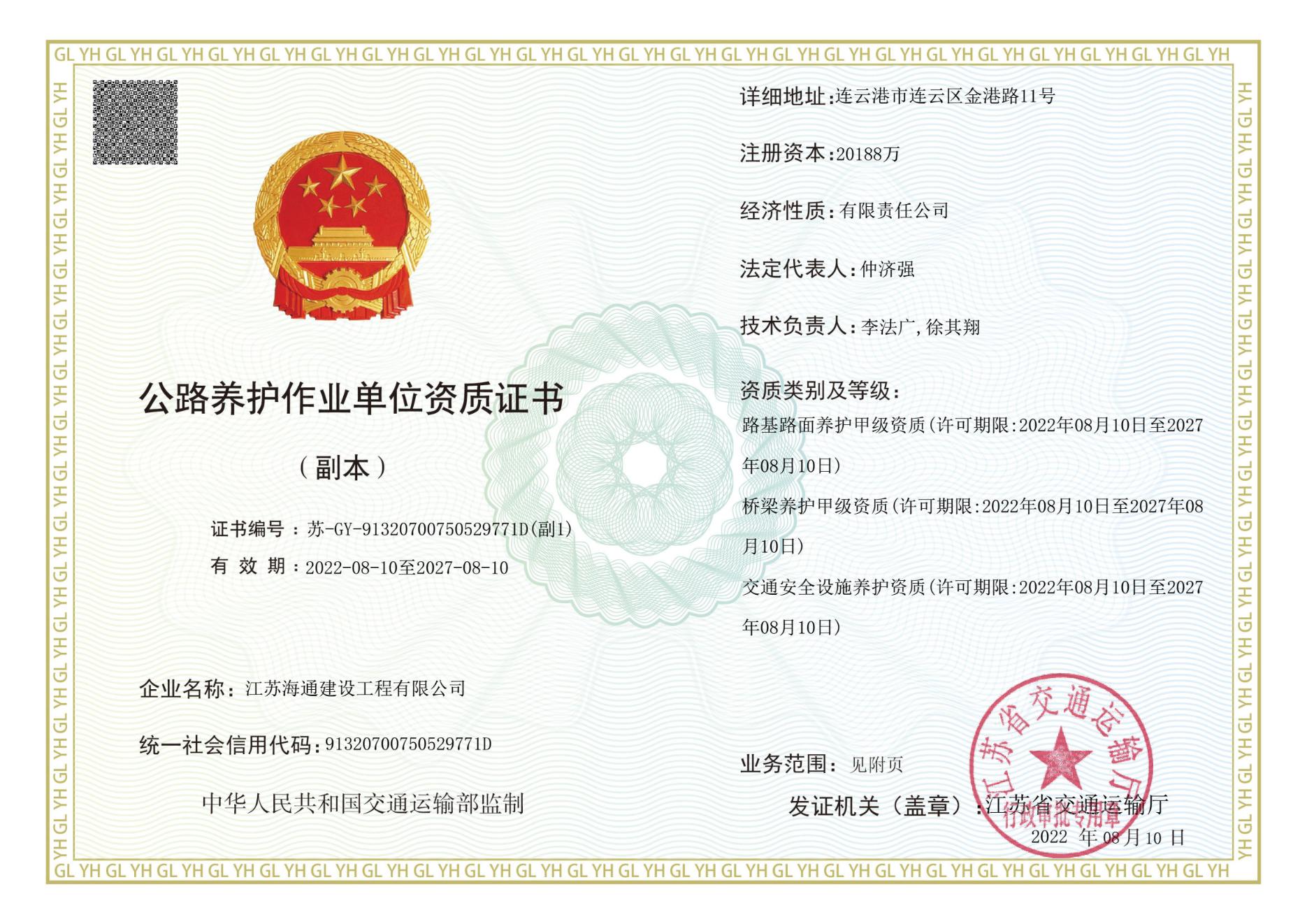 近日,江苏海建公司增项公路养护作业资质工作传来佳音,经江苏省交通运输厅核准,公司申报的路基路面养护甲级、桥梁养护甲级级、交通安全设施养护资质成功获批并取得证书。