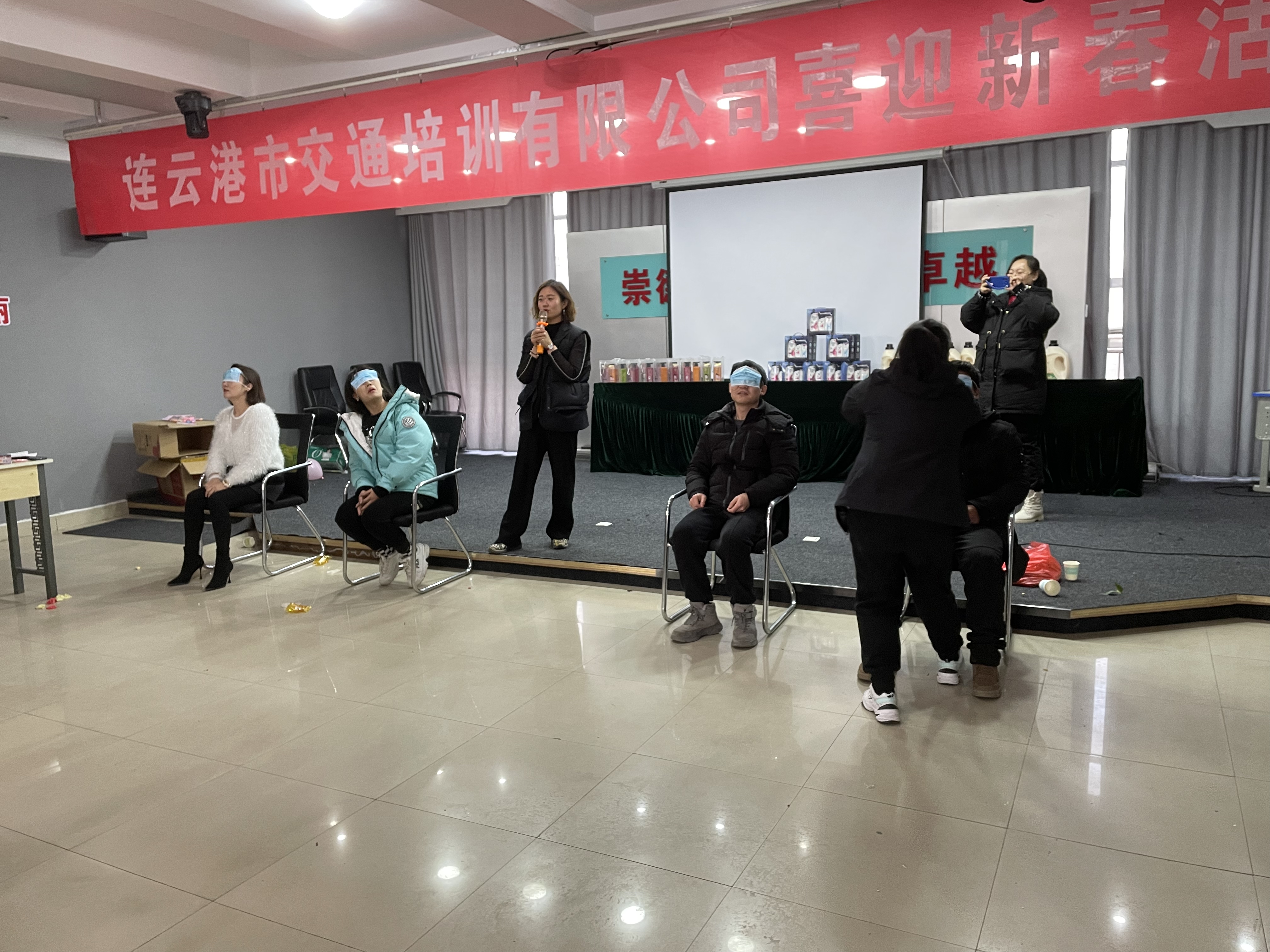 首先进行的是夹纸运杯”。参赛者们需要双腿夹住一张A4纸,将头上放置的纸杯中的橘子运送到目的地,运送数量多的为赢家,主持人宣读完规则后,第一组的参赛者们已跃跃欲试,他们每个人充满信心,以积极饱满的心态努力往前冲。观众们大声的呼喊为他们加油;然后进行的是蒙眼吃食物”。大家两两组队,因为喂食物和吃食物的双方都蒙上了眼睛,只能凭声音来辨别方位,有的参赛者甚至走到了相反方向,找错了队友,“我在这里,快快快”、“刘姐,您在哪,我在最右边”......大家纷纷用不同方法告诉队友自己的位置;接着是抢红包游戏。红包里有写有各种各样的礼品的字条,每轮6人参赛,站在桌子两边,主持人会发出触碰自己身体不同部位的指令,当主持人发出“红包”指令,大家需要立刻抢桌上的红包。大家乐在其中,玩的津津有味。