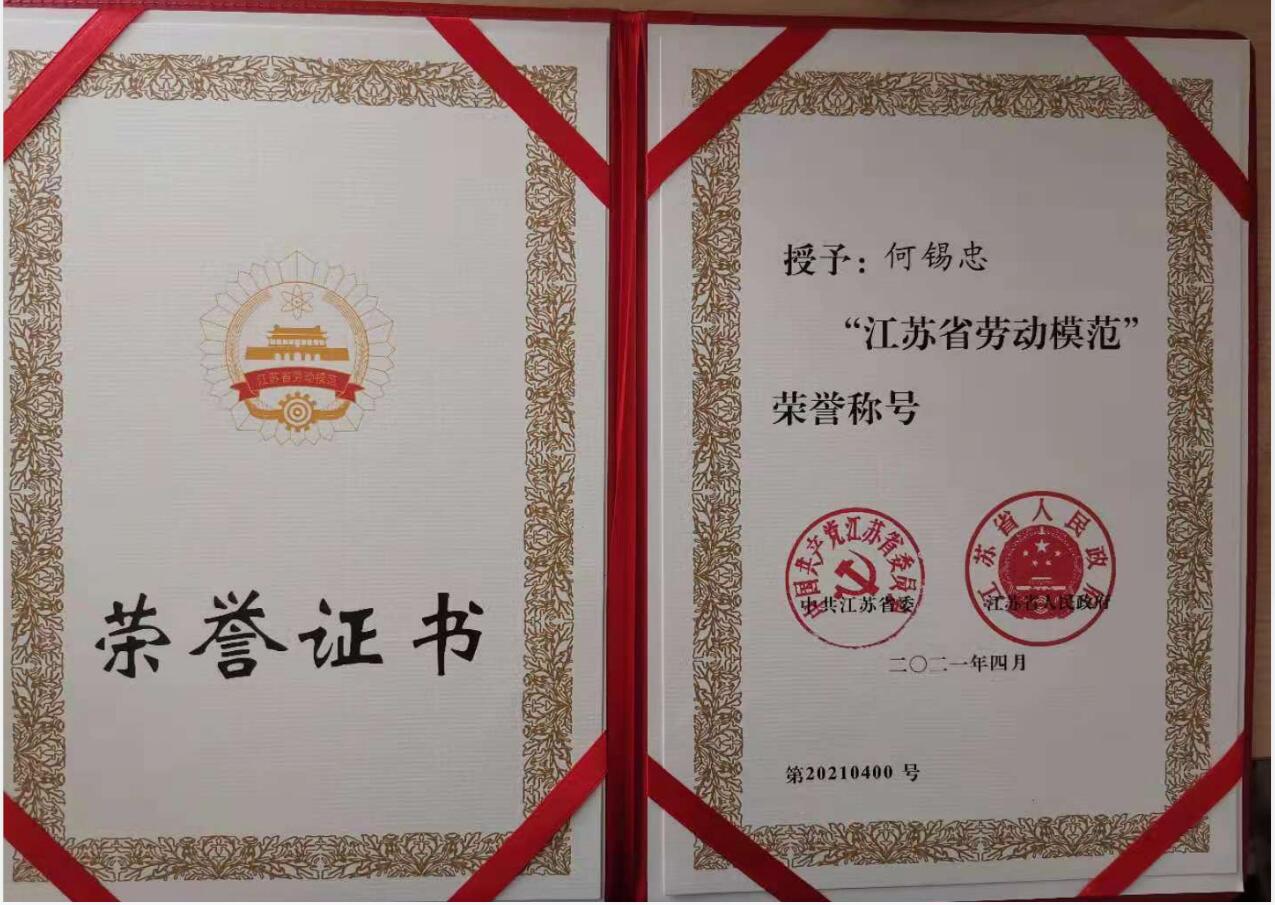 为进一步弘扬当代工匠精神,营造全省人民争劳模、学劳模的良好氛围,2021年,中共江苏省委员会和江苏省人民政府联合在全省范围内开展2021年江苏省劳动模范和先进工作者推荐评选工作本着公开、公平、公正原则,经基层单位推荐专家评比社会监督。近日,何锡忠同志被授予“江苏省劳动模范”荣誉称号。