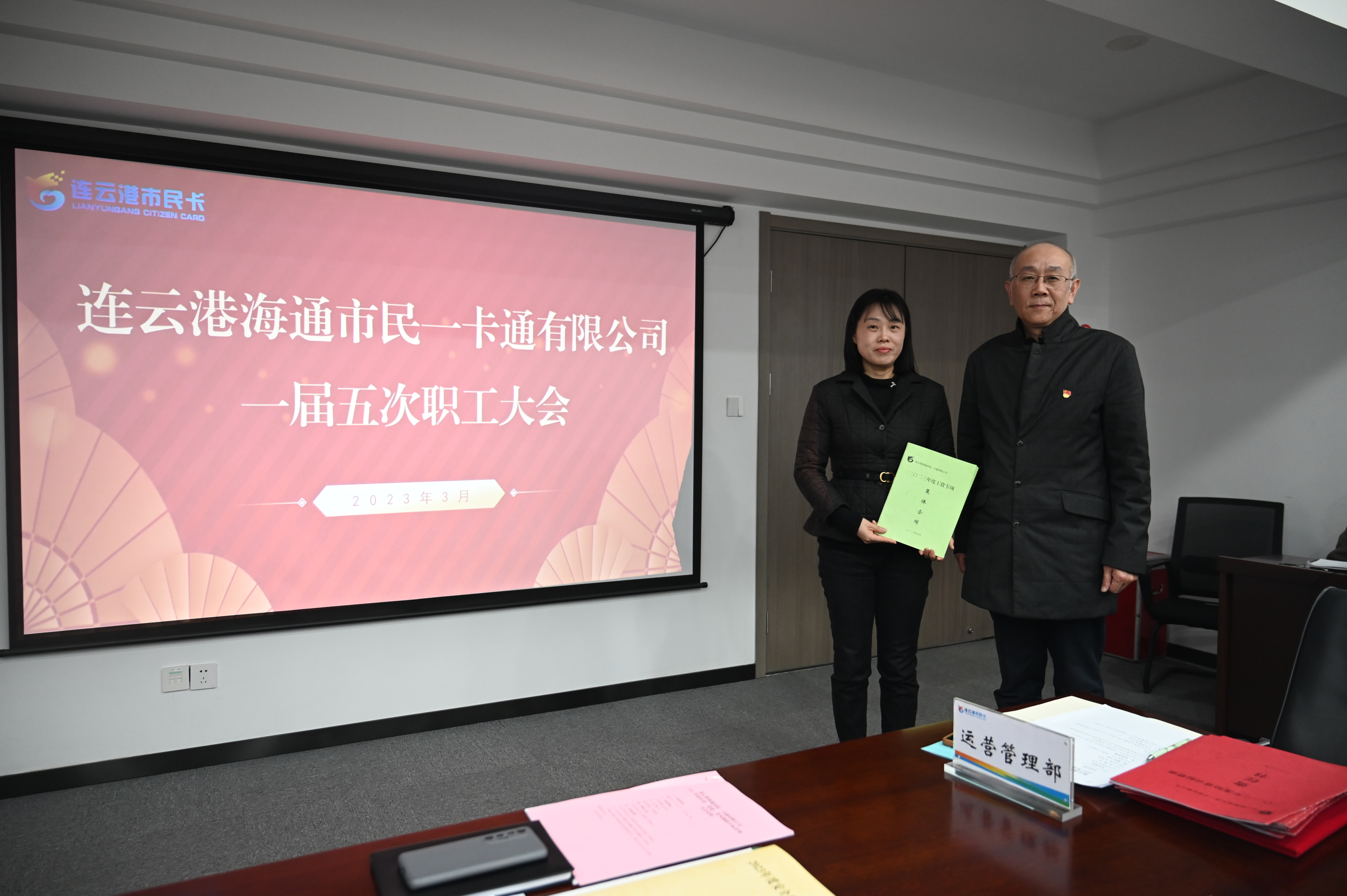 会议审议通过了《2022年度工作报告》《2022年度工会工作报告》《2022年度决算报告暨2023年度预算报告》《连云港海通市民一卡通有限公司职工手册》,工会主席王冰向公司党支部书记、总经理叶星妍递交了市民卡公司《“1+3”集体合同》。