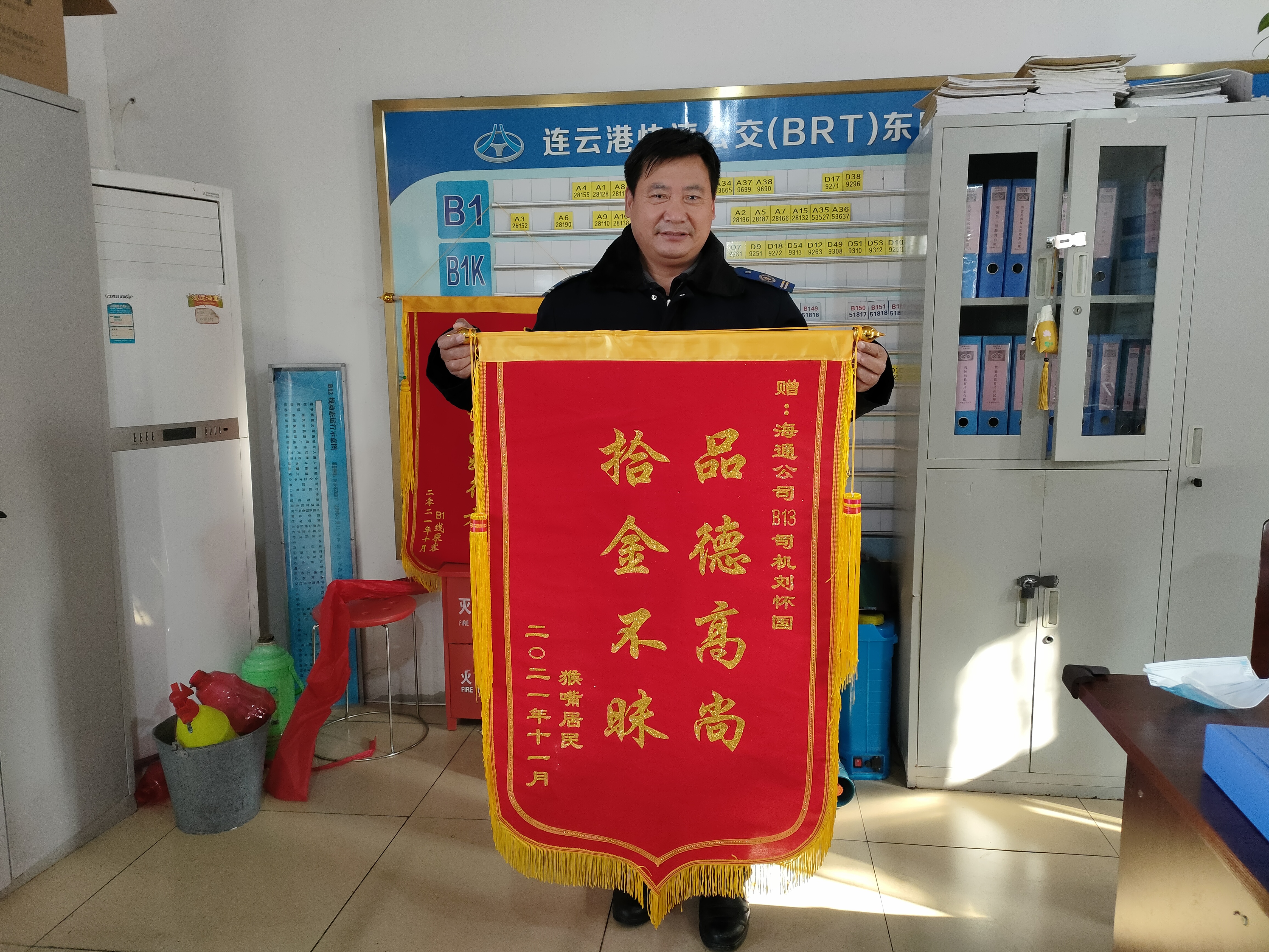 11月28日上午,失主张老先生特意将一面锦旗送到了东城分公司调度室,以表达对驾驶员刘怀国的感激之情!