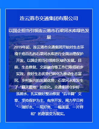 近年来,连云港市交通控股世界杯app最新版下载,世界杯(中国)权属交通世界杯app最新版下载,世界杯(中国)按照“生态+,交通+,文旅+,产业+”理念,持续为石梁河水库“疗伤”,以悬壶济世的民本情怀妙手回春,守护一泓碧水,彰显国企担当,着力将其打造为连云港市第三张旅游名片,实现看海、观湖、游花果山愿景,让习近平总书记“绿水青山就是金山银山”的科学论断成为生动实践,被江苏省委书记吴政隆评价为“把良好生态优势转化为推动生态富民、乡村振兴的发展优势”。